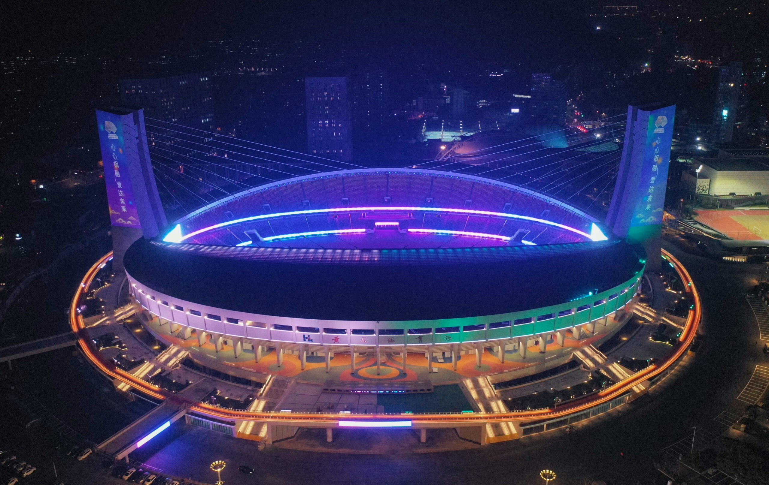 12月20日,位于浙江杭州的浙江省黄龙体育中心体育场展示杭州亚运会主题灯光效果,该体育场于近日完成改造,并将在2022年承办杭州亚运会足球比赛。 未经允许不得转载:城市新闻网icitynews » 航拍浙江省黄龙体育中心体育场绚丽夜景