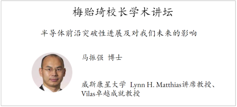 炉边访谈之后,是”梅贻琦校长纪念讲坛”环节。讲坛邀请了清华校友、美国威斯康星大学教授马振强博士来做题为”半导体前沿突破性进展及对我们未来的影响“的主题报告。