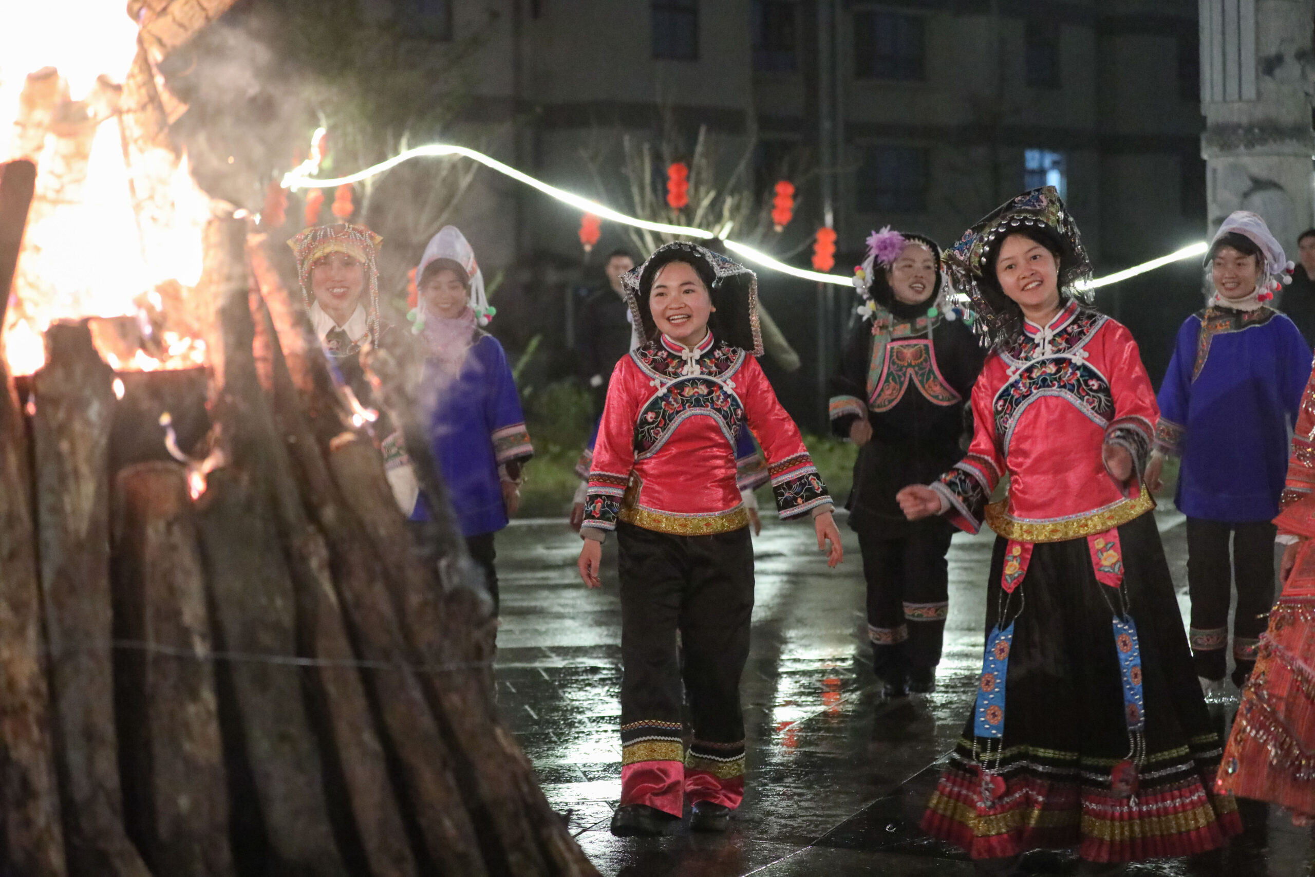 12月31日晚,贵州省黔西南布依族苗族自治州普安县茶源街道,少数民族同胞举行篝火晚会,迎接2022年到来。