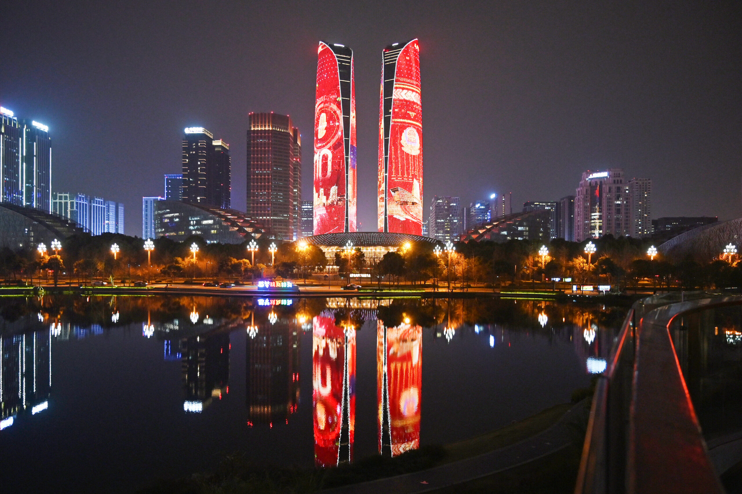 1月10日,第二个中国人民警察节,四川省成都市环球中心、天府熊猫塔、金融城双子塔、东安湖体育公园主体育场等地标建筑陆续亮灯,致敬人民警察。 未经允许不得转载:城市新闻网icitynews » 成都点亮地标 庆祝中国人民警察节