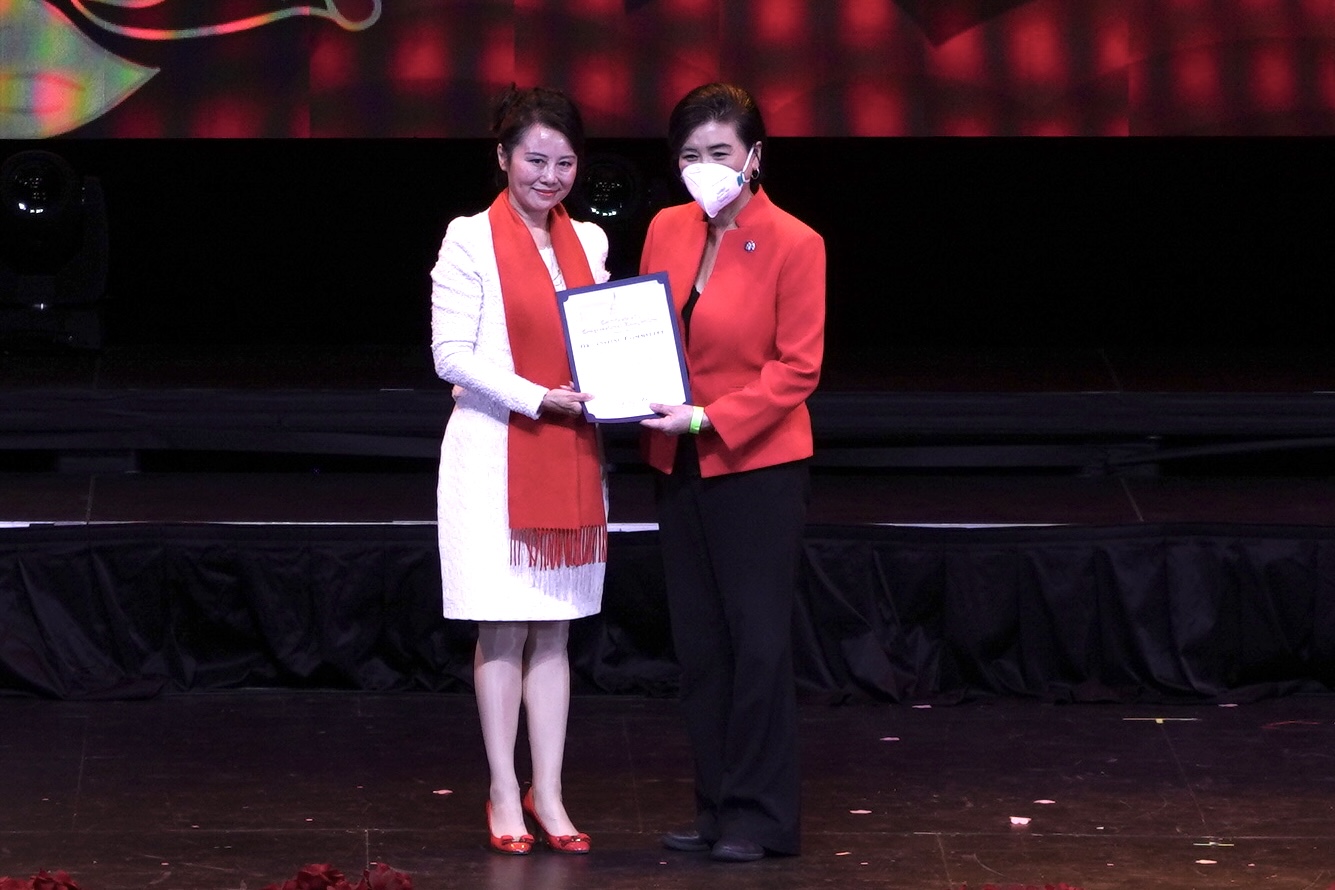 美国国会议员赵美心致辞,预祝晚会取得圆满成功,同时肯定了华人社团在疫情期间所做的贡献,感谢他们付出的爱心。