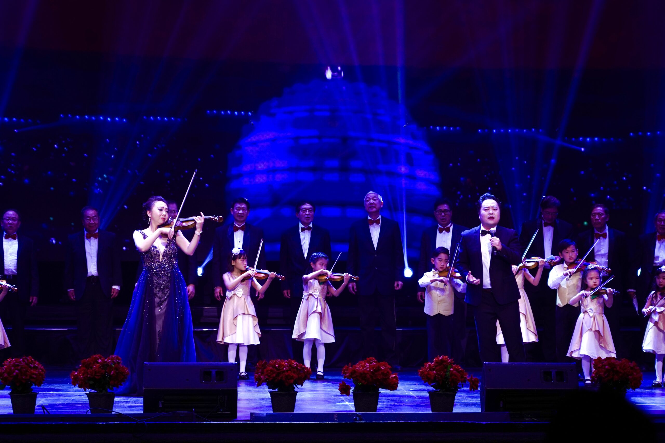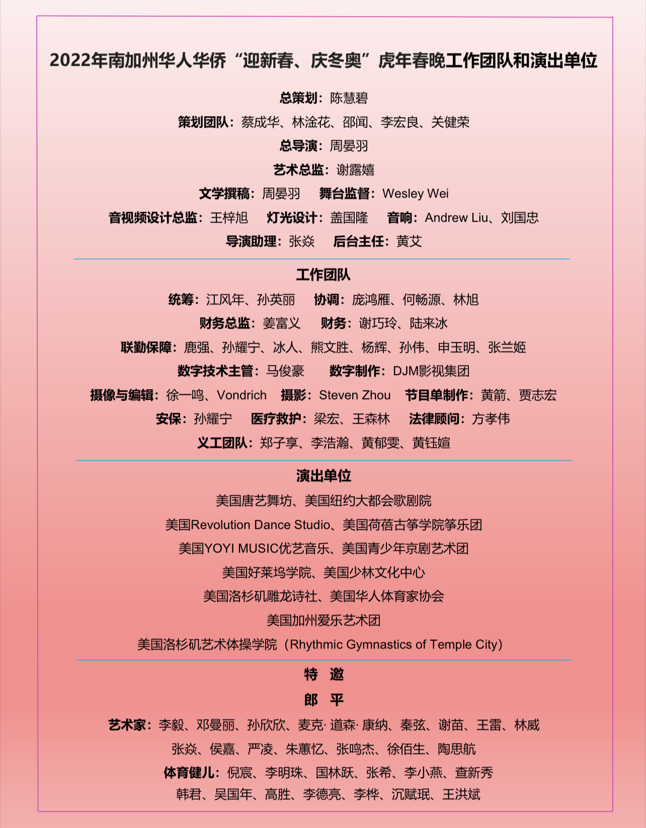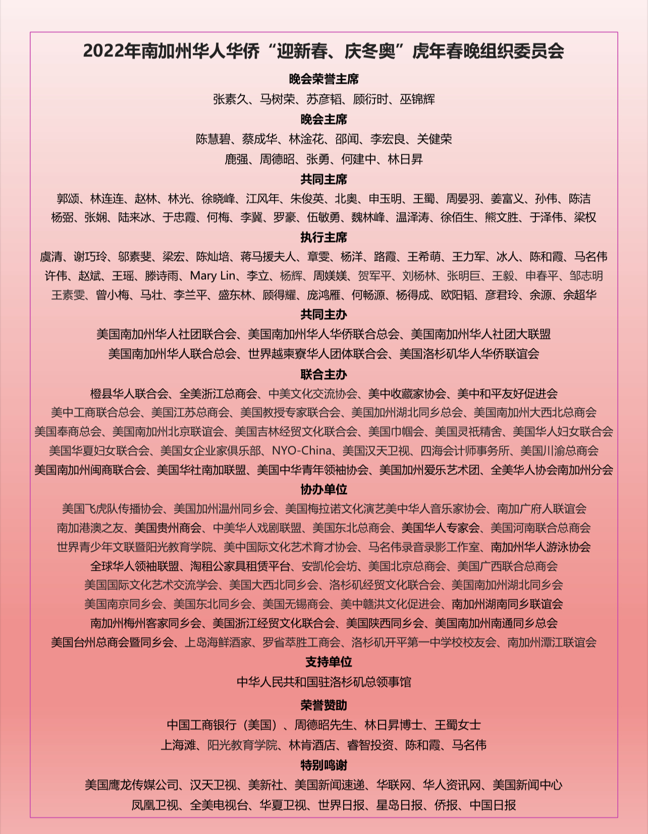 晚会联合主办方共同主席美中和平友好促进会会长鹿强、美中收藏家协会会长周德昭、中美文化交流协会会长王蜀、美国南加州华人社团联合会理事长郭颂、美国教授专家联合会会长林连连、美国加州湖北同乡总会会长赵林、全美浙江总商会会长林光、美国江苏总商会会长徐晓峰、美中工商联合总会会长张勇、橙县华人联合会会长/晚会总导演周晏羽、美国南加州大西北总商会会长江风年、美国南加州华人社团联合会执行会长北奥、美国奉商总会会长朱俊英、美国南加州北京联谊会会长申玉明、美国吉林经贸文化联合会会长孙伟、美国巾帼会会长陈洁、美国灵祇精舍会长杨弼、美国华人妇女联合会理事长张娴、美国华夏妇女联合会会长陆来冰、美国女企业家俱乐部会长于忠霞、NYO-China总裁何梅、美国汉天卫视董事长李冀、美国川渝总商会会长陈慧碧、美国南加州闽商联合会会长伍敏勇、美国华社南加联盟总召魏林峰、美国中华青年领袖协会会长温泽涛、美国加州爱乐艺术团团长徐佰生、美国南加州华人联合总会理事长熊文胜、美国南加州华人联合总会监事长于泽伟、全美华人协会南加州分会会长梁权,及执行主席虞清、谢巧玲、邬素斐、梁宏、陈灿培、蒋马援夫人、章雯、杨洋、路霞、王希萌、王力军、 冰人、陈和霞、马名伟、许伟、赵斌、王瑶、滕诗雨、Mary Lin、李立、杨辉、 周媄媄、贺军平、刘杨林、张明巨、王毅、申春平、邹志明、王素雯、曾小梅、马壮、 呼延涛、盛东林、顾得耀、庞鸿雁、何畅源、杨得成、欧阳韬、彦君玲、余源、余超华
