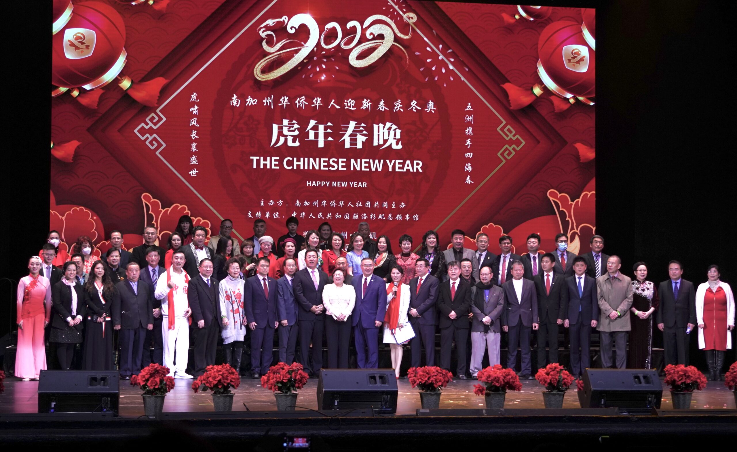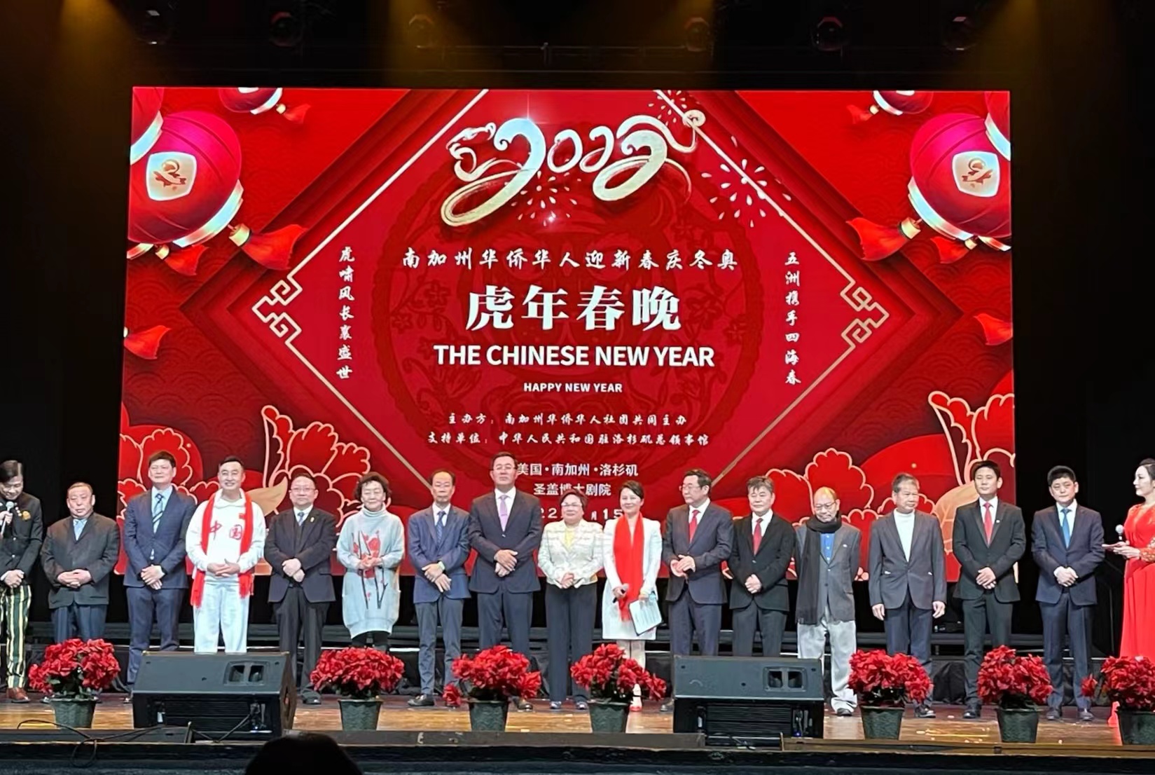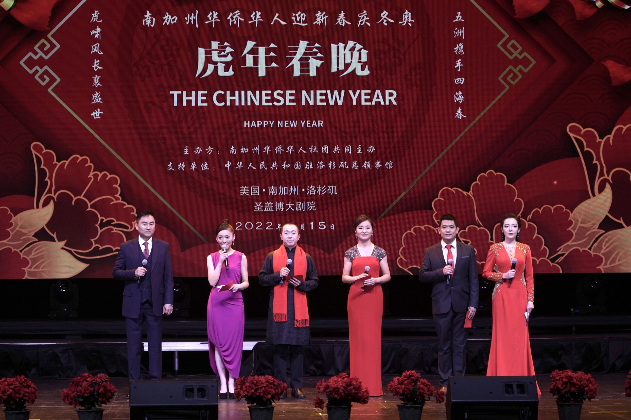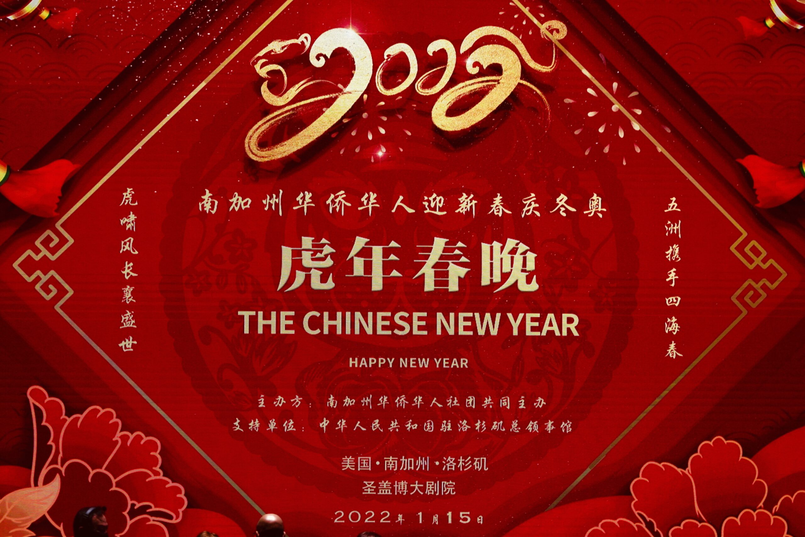 为喜迎 2022 年中国农历新年和北京冬季奥运会隆重开幕,在中华人民共和国驻洛杉矶总领事馆的支持下,在南加州华人社团的共同努力下,由南加州华人社团联合会、美国南加州华人华侨联合会、美国南加州华人社团大联盟、美国南加州华人联合总会、世界越柬寮华人团体联合会、美国洛杉矶华人华侨联谊会共同举办,众多社团联合举办、协办的《2022年南加州华人华侨“迎新春、庆冬奥”虎年春晚》于1月15日在圣盖博剧院隆重举行。