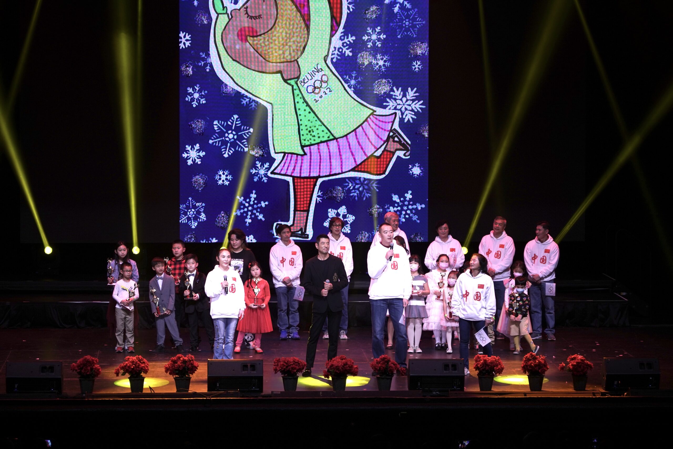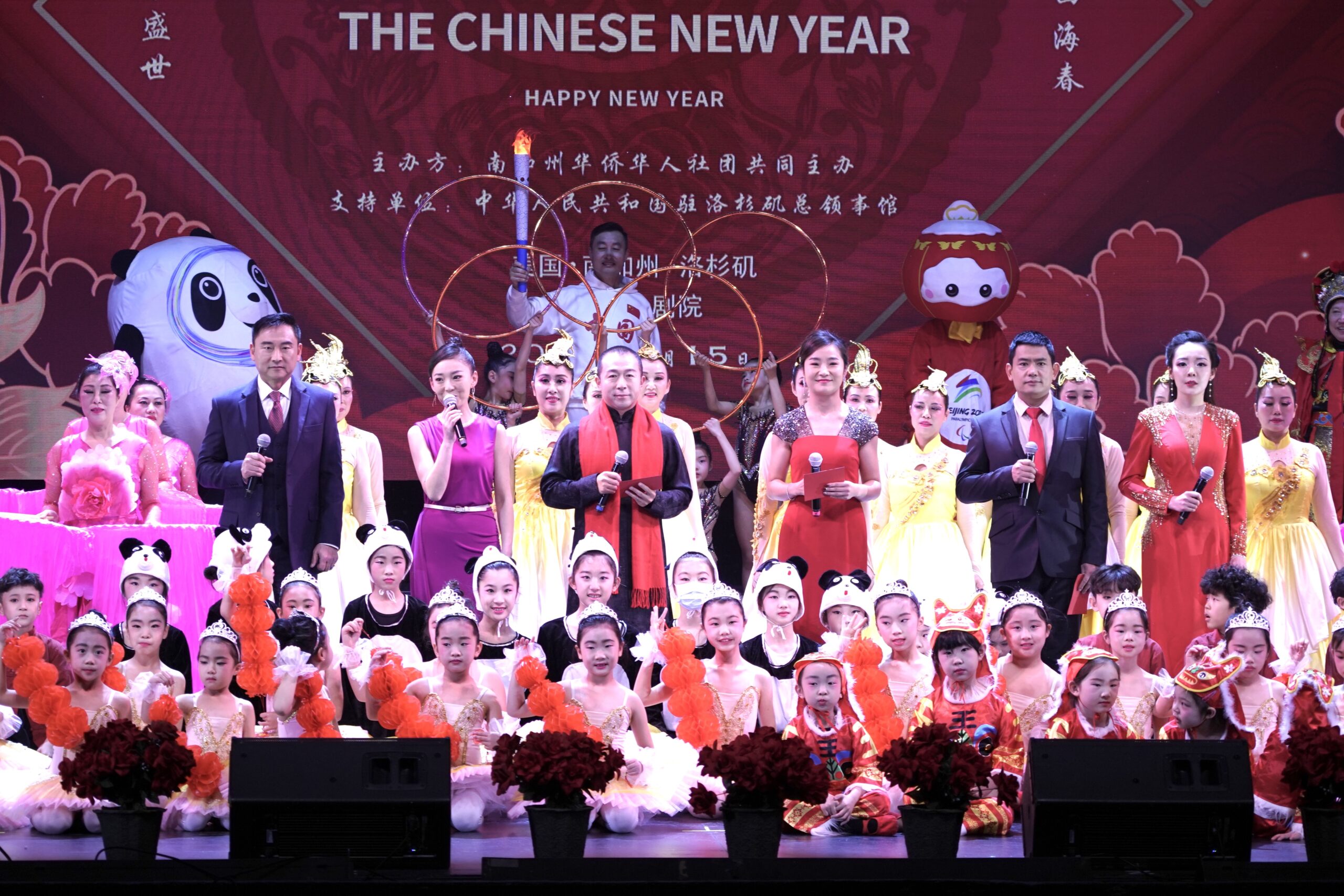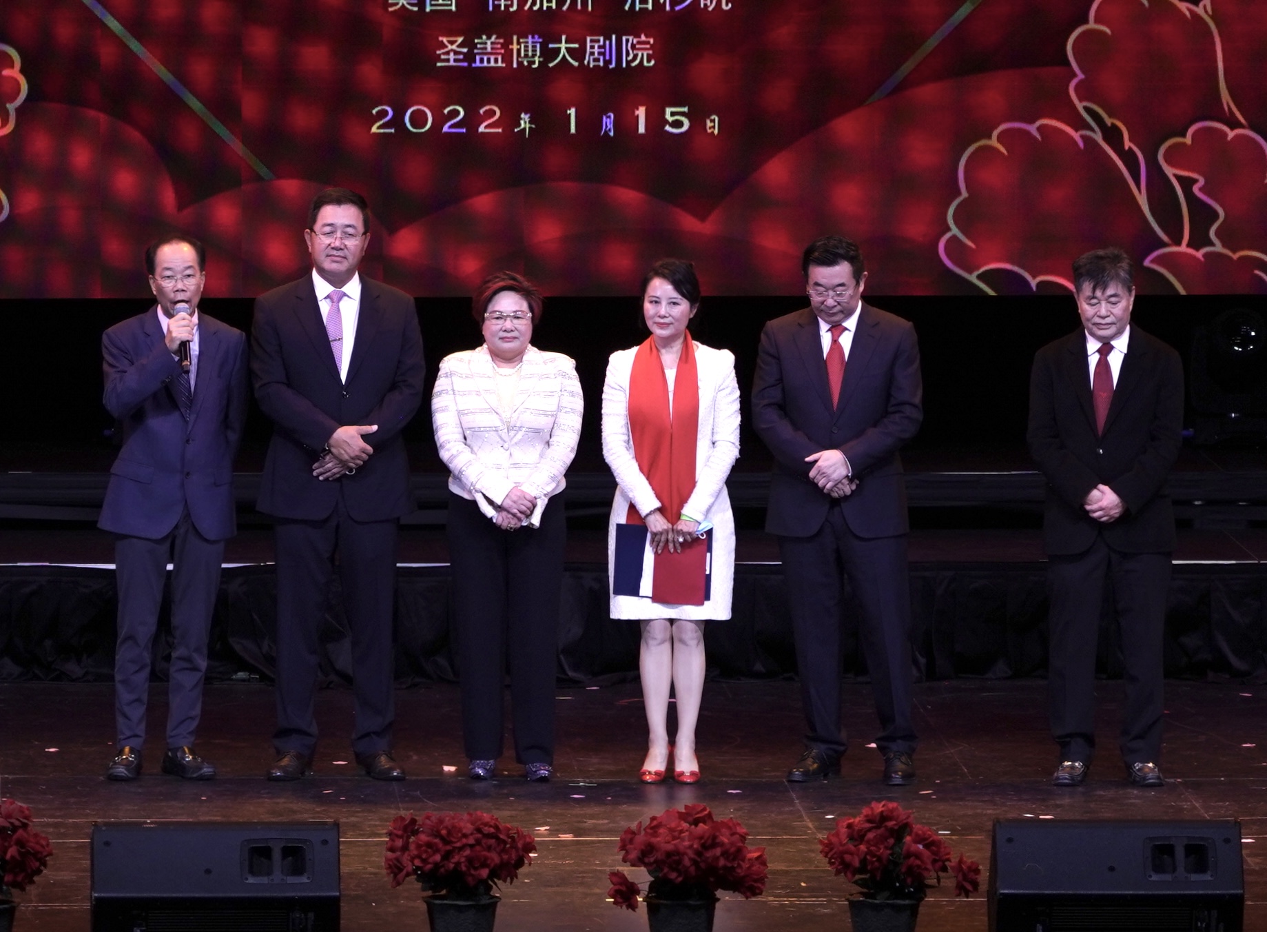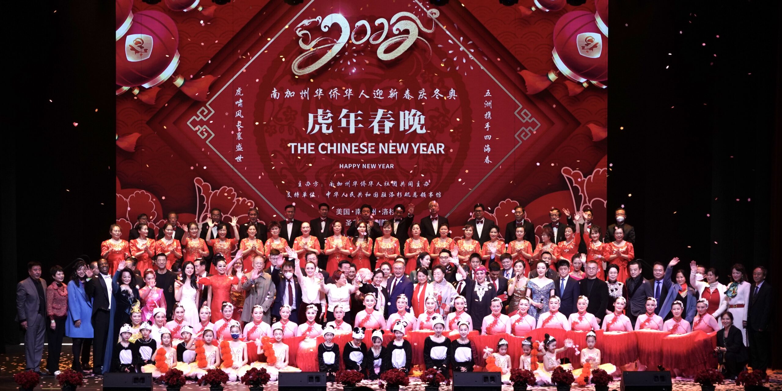 为喜迎 2022 年中国农历新年和北京冬季奥运会隆重开幕,在中华人民共和国驻洛杉矶总领事馆的支持下,在南加州华人社团的共同努力下,由南加州华人社团联合会、美国南加州华人华侨联合会、美国南加州华人社团大联盟、美国南加州华人联合总会、世界越柬寮华人团体联合会、美国洛杉矶华人华侨联谊会共同举办,众多社团联合举办、协办的《2022年南加州华人华侨“迎新春、庆冬奥”虎年春晚》于1月15日在圣盖博剧院隆重举行。