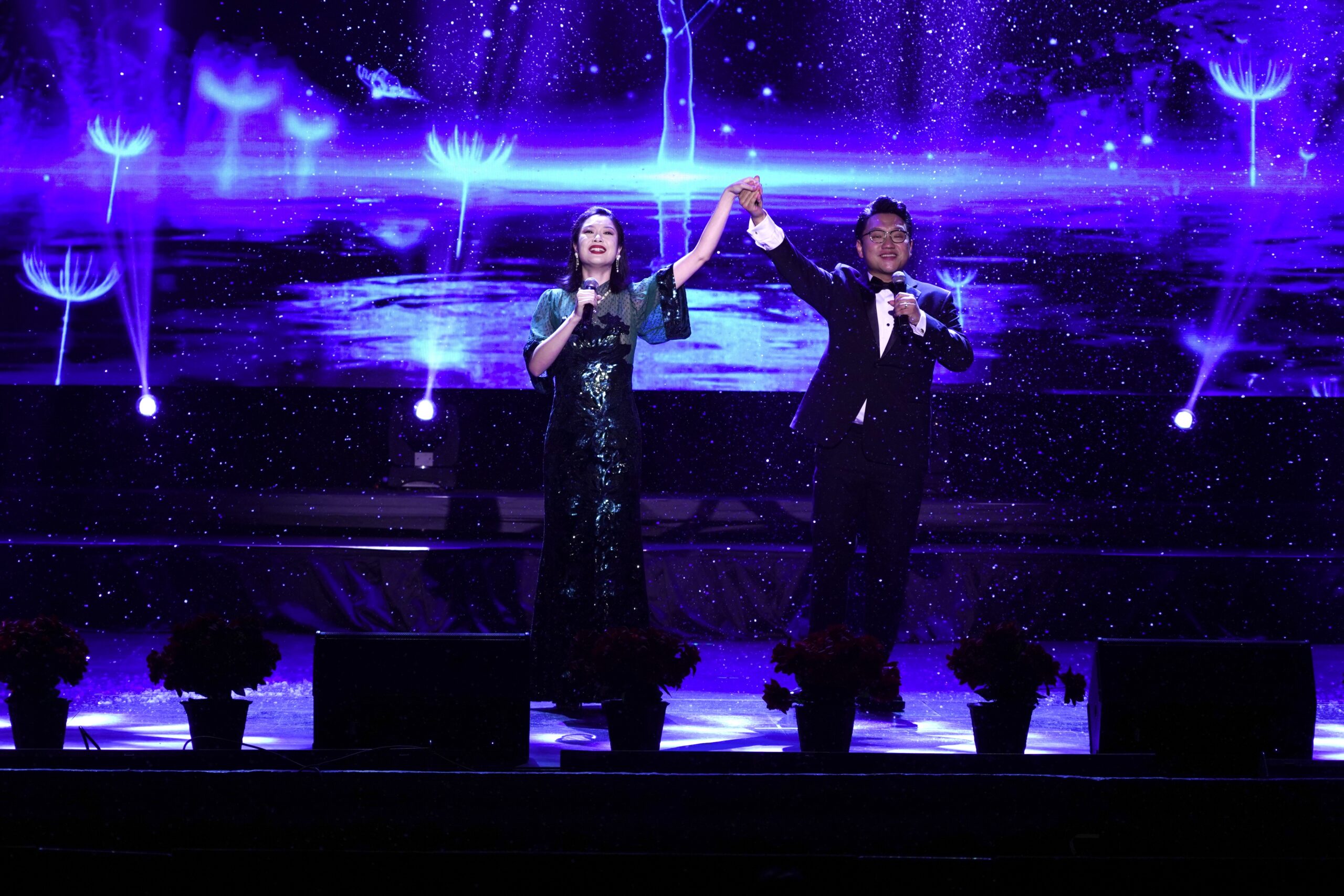 晚会荣誉主席美国南加州华人社团联合会荣誉主席张素久,美国洛杉矶华人华侨联谊会创会会长马树荣,美国鹰龙传媒有限公司董事长苏彦韬,美中人才交流协会会长顾衍时,世界越柬寮华人团体联合会署理主席巫锦辉