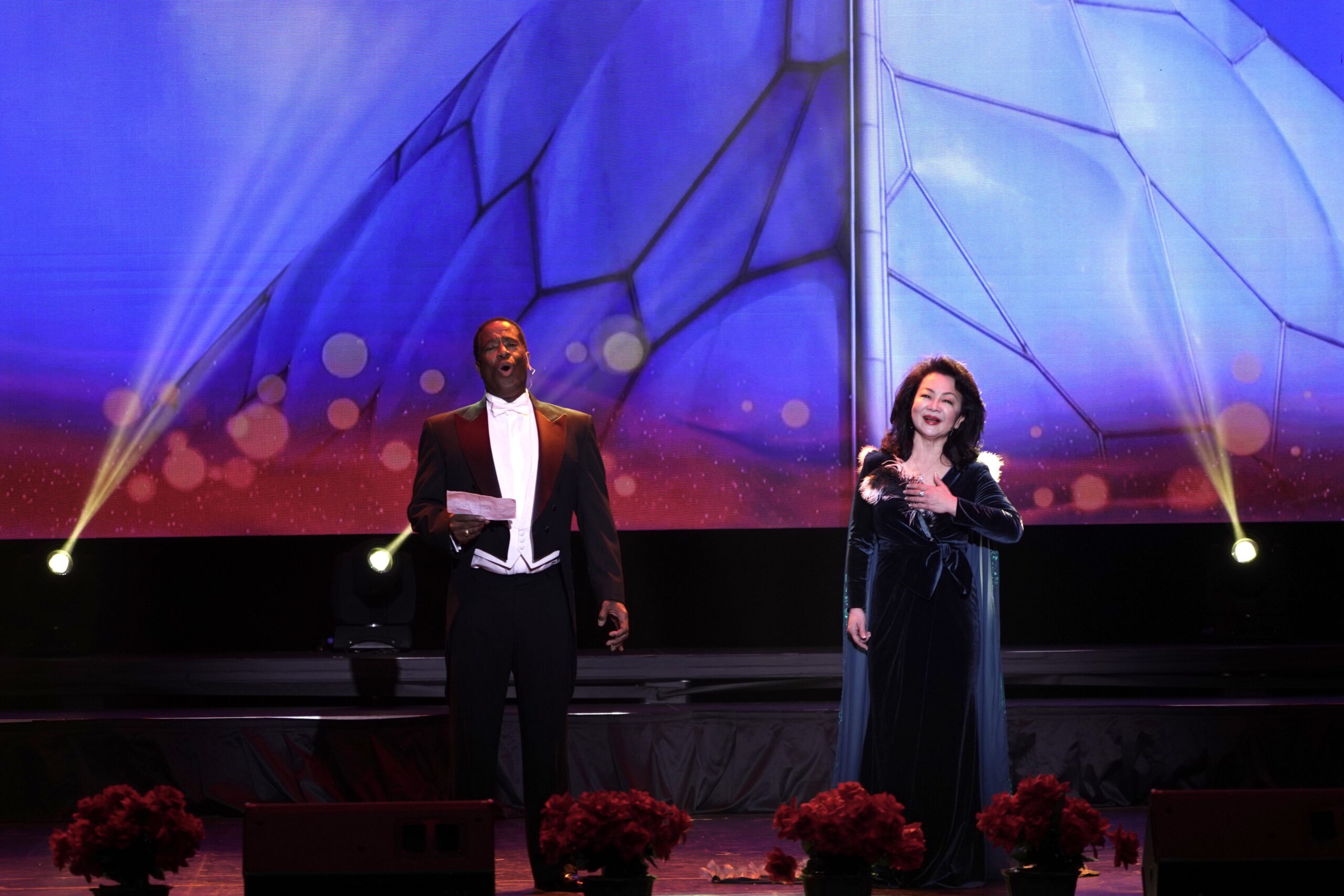 中华人民共和国驻洛杉矶总领事馆总领事张平大使出席晚会并登台讲话和向南加州广大华侨华人致以新春的祝福,美国国会众议员赵美心女士出席晚会并发表致辞,著名排球女将郎平也在晚会上登台与大家见面。出席晚会的重要嘉宾包括:中国工商银行(美国)行长何建中、中国东方航空公司北美地区营销中心总经理李留军、圣盖博市长廖钦和、副市长丁言愉、蒙市市长饶影凡、阿凯迪亚市长戴守真、阿凯迪亚警察基金会主任Ben张。晚会主席、荣誉主席、共同主席、执行主席将登台以各种形式表现喜迎新春和预祝冬奥,并向在场的观众拜年。晚会充分展现侨领们在农历新年期间对北京冬奥会、对华人华侨、对家人和朋友的美好祝福,共同祝愿大家新春快乐和2022北京冬奥圆满成功。