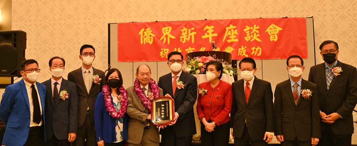 城市新闻1月14日圣盖博市报道,侨界新年座谈会上,美国美亚国际总商会会长陈鸿奕、洛杉矶华人华侨联谊会主席关键荣向马树荣主席颁发「杰出成就奬」。陈鸿奕会长、关键荣主席表示,向德高望重的马树荣主席颁发长期服务侨界的「杰出成就奬」,以表彰和感谢他热心服务侨社30多年,及所取得的杰出成就