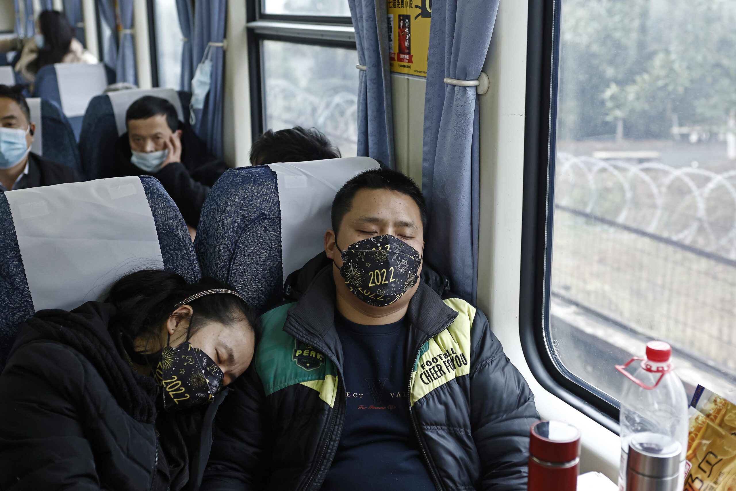 1月25日,旅客在K4249次列车车厢内休息。1月24日晚22时57分,从上海南站开往贵阳的K4249次列车驶离上海。2022年的春运是疫情影响下的第三个春运,从1月17日开始,到2月25日结束,共40天。