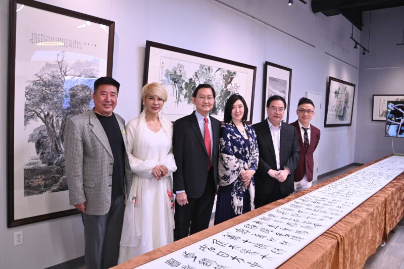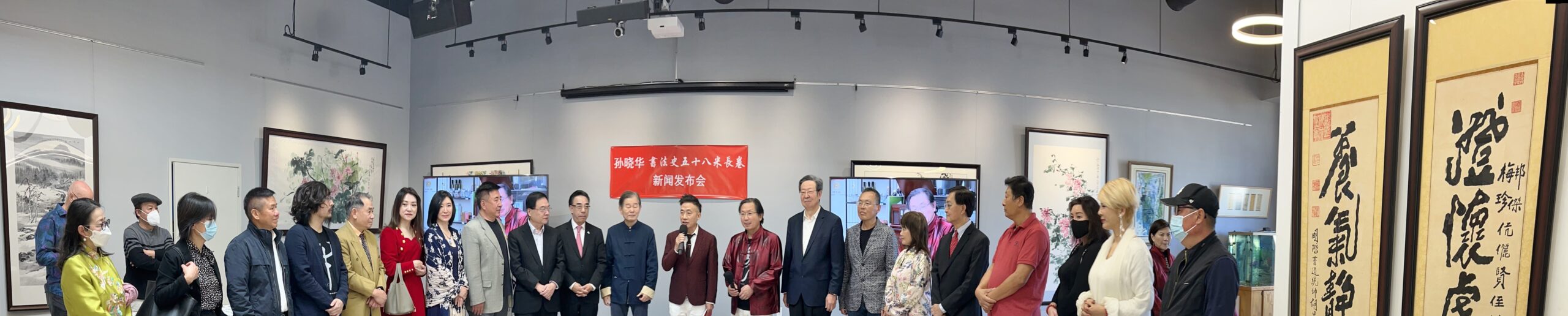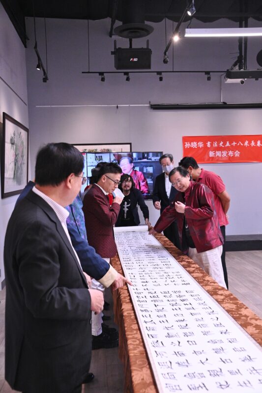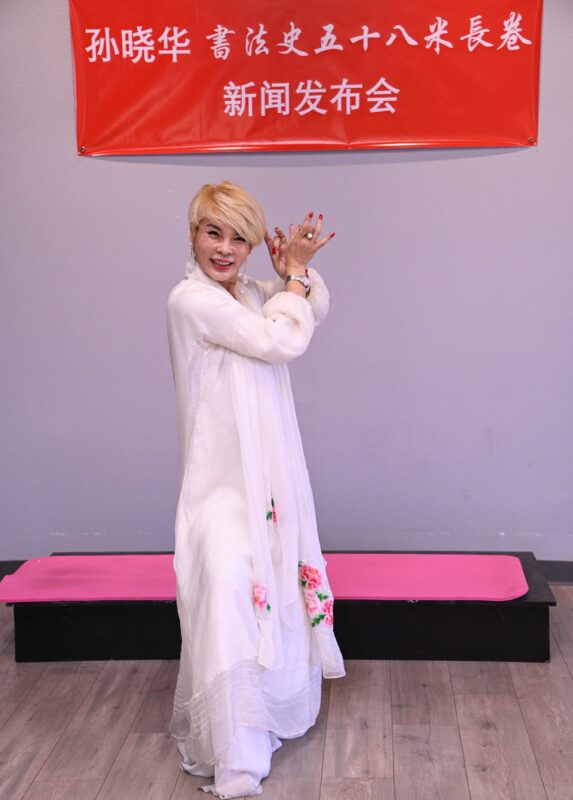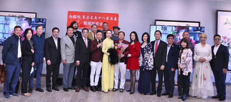 城市新闻2月11日奇诺市报道,贺新春,庆冬奥,旅美著名书法家孙晓华历时5个多月,精心创作58米书法长卷,篆隶楷行草,五体皆俱,书写成 “书法史”长卷,独一无二,蔚为壮观。前蒙特利公园市市长林达坚等侨界知名人士岀席在意庐会所举行的新闻发布会。著名双语主持人彭南林主持。中国禅模琳琳(Gaga)作现场表演,衬托孙晓华长卷“书法史” 的展示。