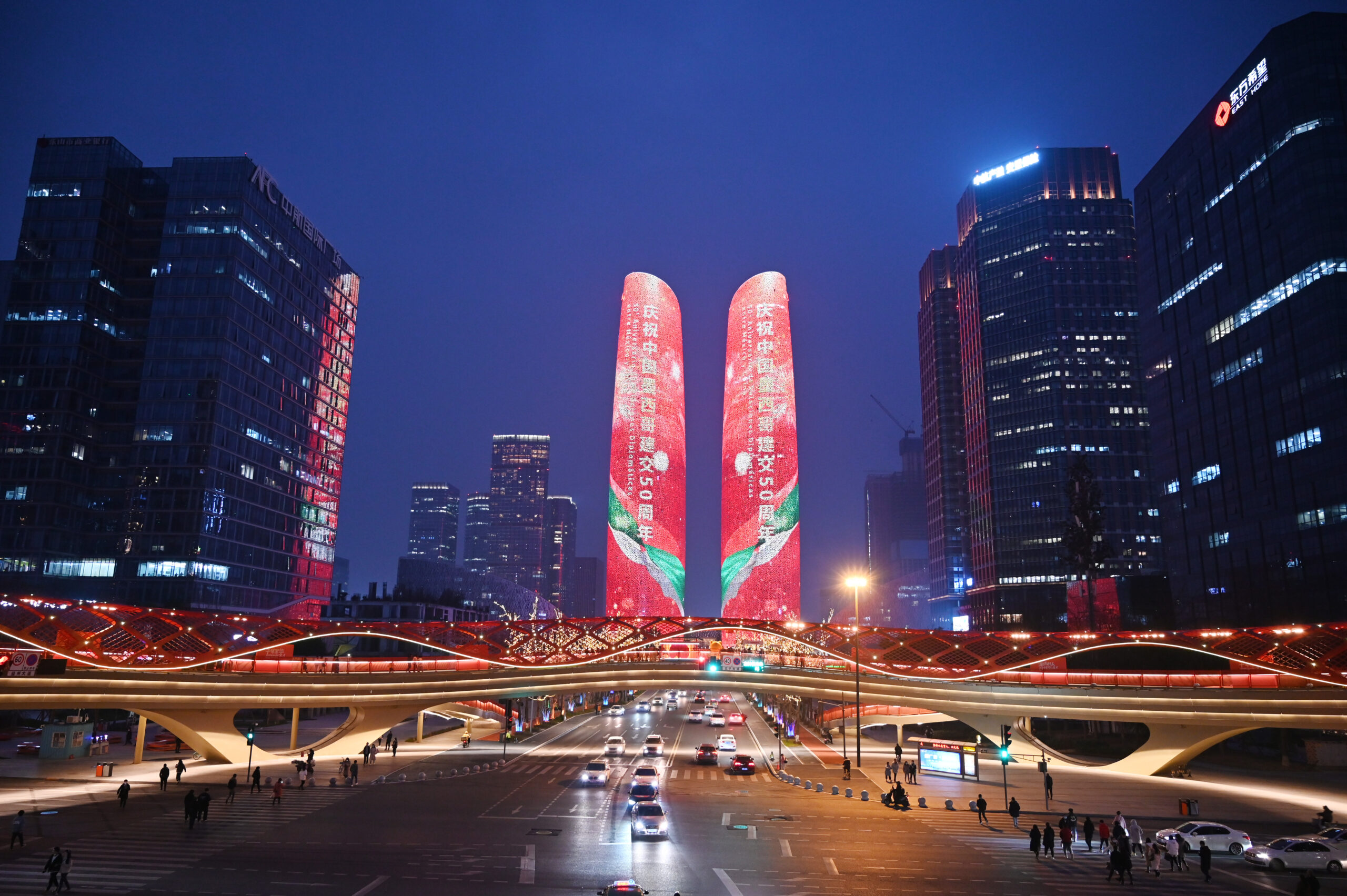 2月14日,成都金融城双子塔亮灯,庆祝中墨建交50周年。据悉,中国与墨西哥于1972年2月14日建立外交关系。今年适逢中墨建交50周年,为体现两国友城之间的友好情谊,中国人民对外友好协会和墨西哥驻华大使馆共同发起组织15对中墨友好城市于建交日当天同时举行庆祝建交亮灯仪式。