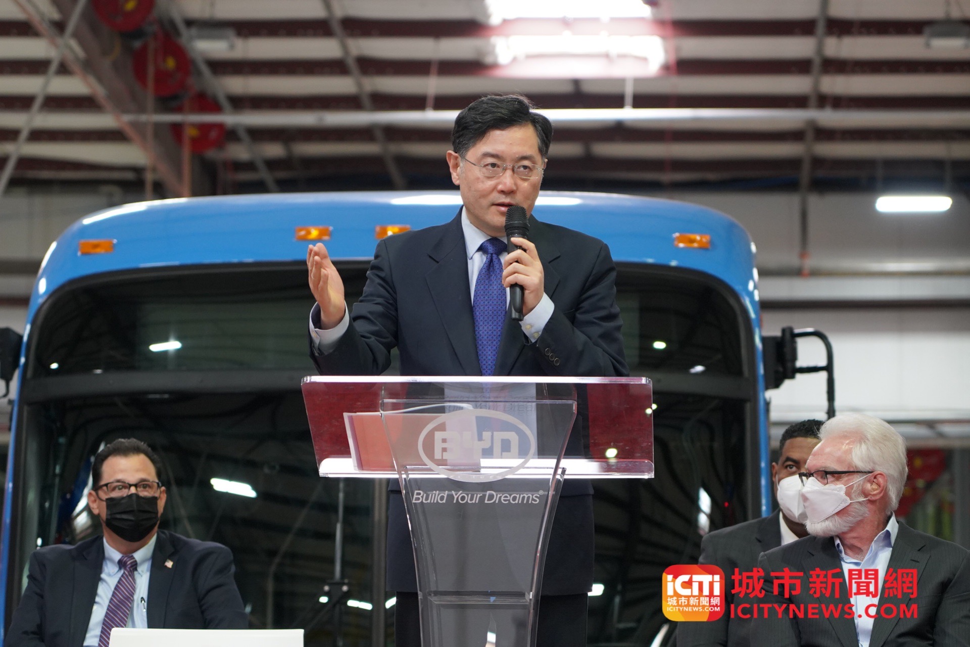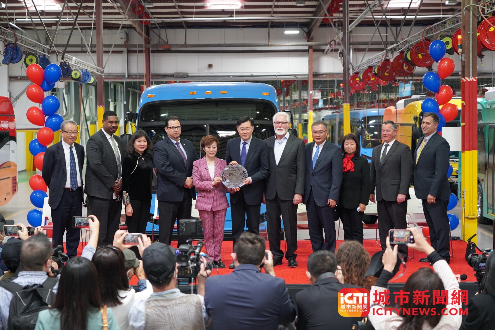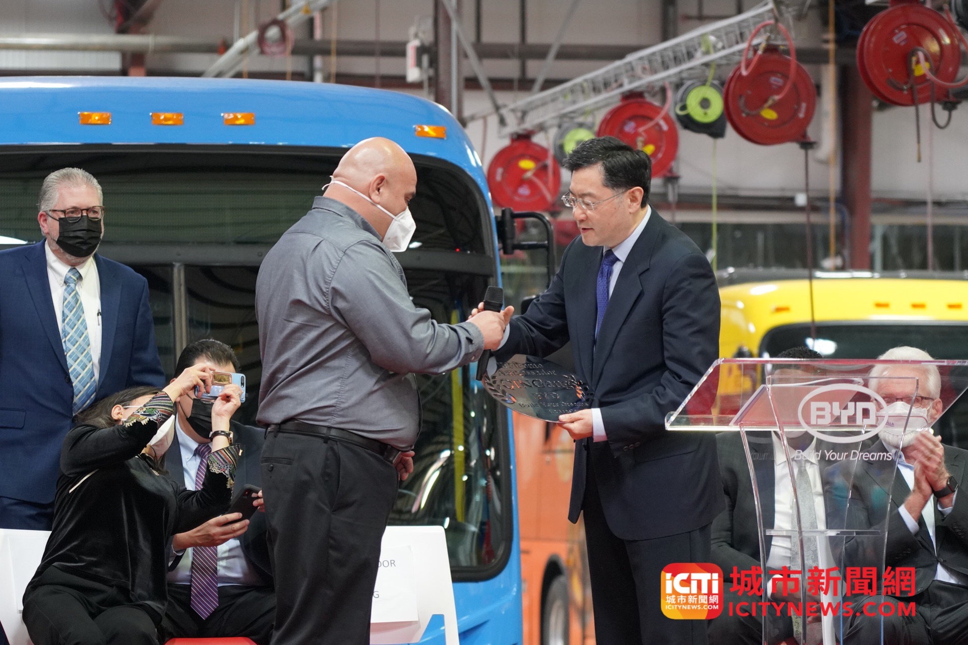 日前,秦刚大使访问位于加利福尼亚州兰卡斯特市的比亚迪大巴工厂,并与兰卡斯特市市长帕里斯共同会见比亚迪全体工人。驻洛杉矶总领事张平陪同访问。
