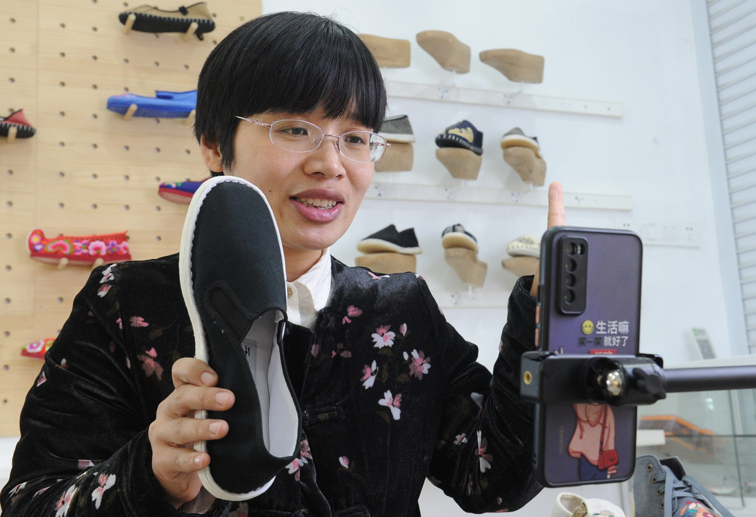 3月8日,张奇奇在直播中介绍布鞋。浙江绍兴“80后”张奇奇自幼患软骨病致下肢畸形,8年前在家乡手工布鞋产业逐渐没落之时,自己通过电商渠道开拓布鞋新销路。在多年创业和经营中,张奇奇带动众多村民以及残障人士等参与布鞋制作,实现增收,同时每年有约30万双布鞋底销往产业下游等市场。当下,张奇奇又“试水”短视频和直播,在完善产业链和产品类目的同时再次拓展新市场。