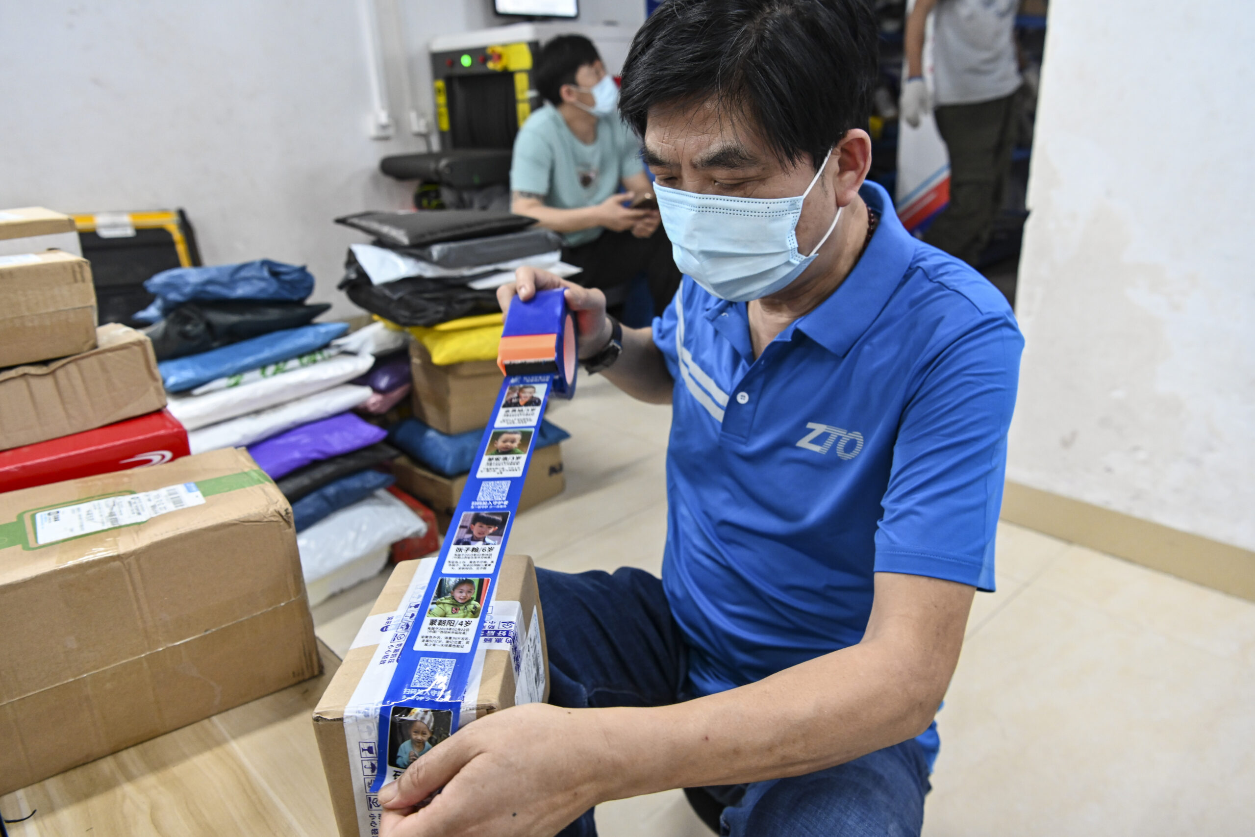 3月18日,广东省广州市,朱忠伟使用“寻亲胶带”打包快递。“寻亲胶带”由中通快递广州永福网点负责人朱忠伟联系工厂自费定制,每卷胶带上都印有6名失踪儿童的信息。从2022年3月起,朱忠伟负责的6家快递网点开始使用“寻亲胶带”打包寄出的快递。朱忠伟表示,“寻亲胶带”通过快递既能发往大城市、也能抵达小乡镇,希望能让更多的人看到失踪儿童的信息。