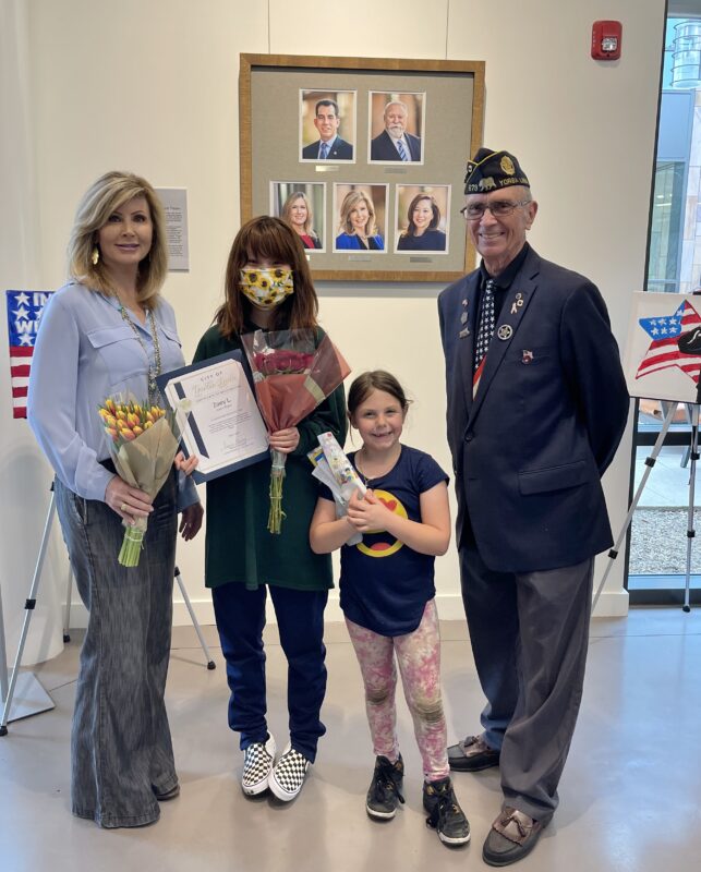 市议员Beth Haney(左1)向爱心女孩周艺(ZOEY)颁发祝贺状
