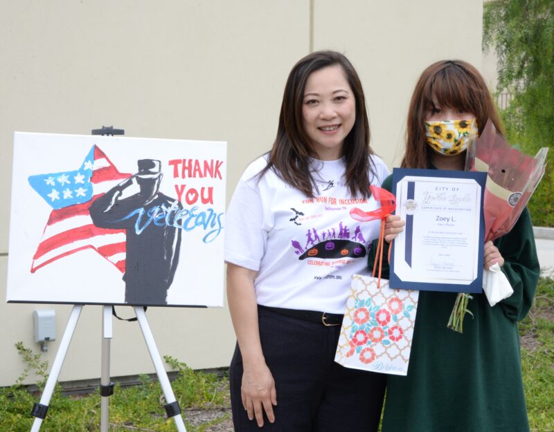 爱心女孩周艺(ZOEY)是一个极有爱心,才华横溢的女孩, 她可以反手钢琴和反手弹古筝, 也可用双手弹奏不同的乐器。 她在绘画和音乐上有非常好的天份。尼克松夫人俱乐部有一个关爱老兵公益项目,她作为爱心女孩负责这个公益项目。爱心女孩周艺(ZOEY)很欣赏奥黛丽.赫本, 她有一个名言: 我们人有两个手, 一个帮助自己, 一个帮助他人, 她希望通过自己的绵薄之力,也可以帮助特殊关爱人群小朋友们, 以及为国家做出贡献的退伍军人们。这次公益活动中, 她的为退伍军人和老兵绘画创作会被陈列在文化艺术中心的艺廊中, 她也在艺术工作区教导孩童们制作彩绘明信片,送给退伍军人。