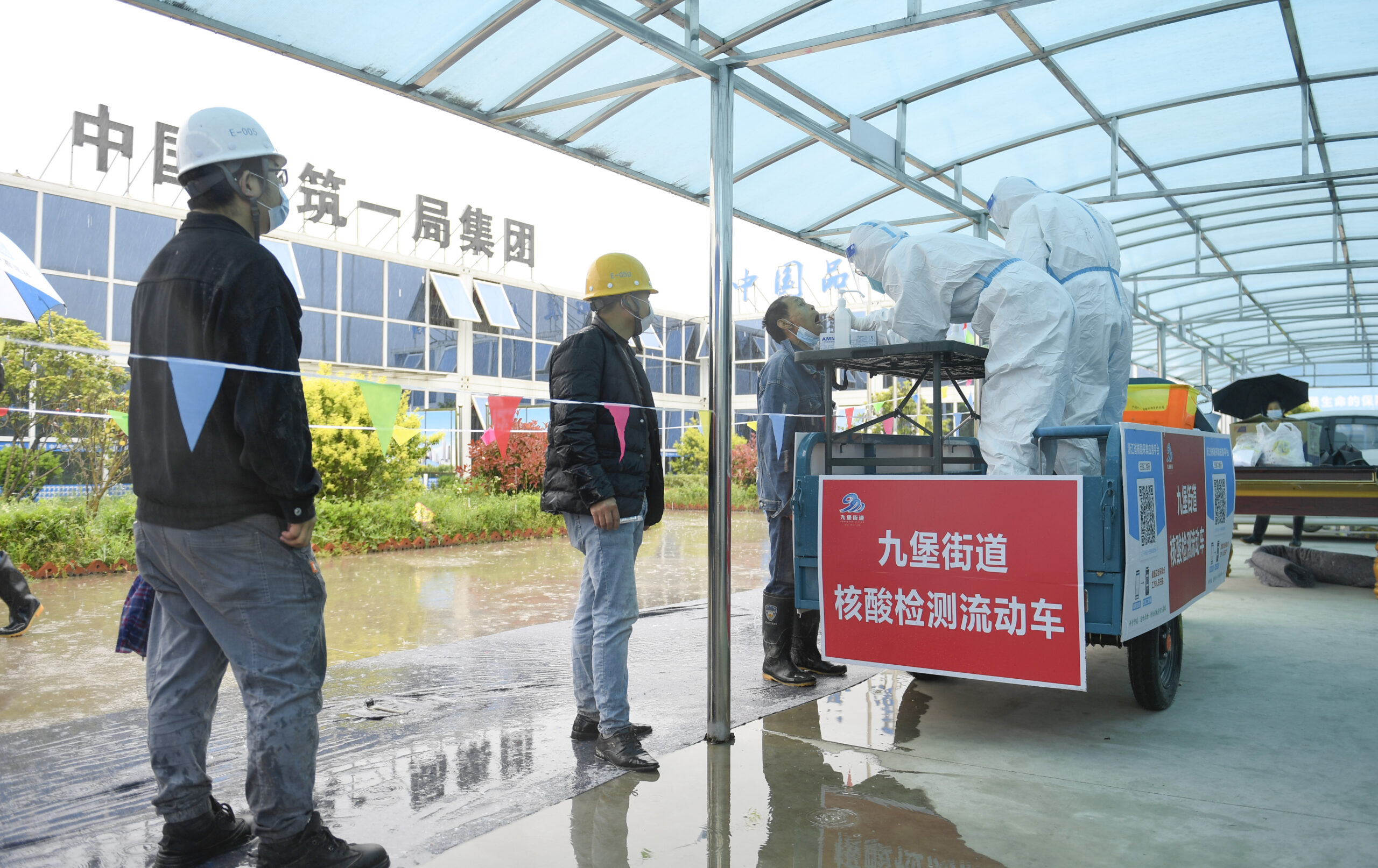 4月13日,浙江杭州,工人在流动采样车前有序排队进行核酸检测。当日,浙江杭州一街道推出三轮车车载核酸采样点,借助灵活移动的特点辗转各工地之间为建筑工地人员进行核酸采样,以减少人员流动和聚集。