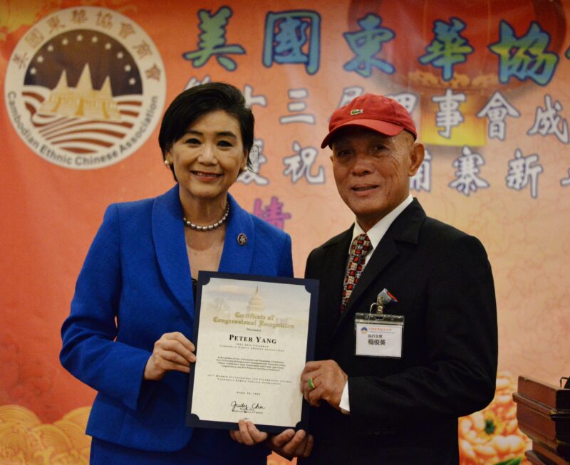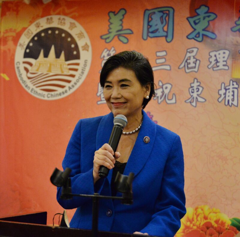 美国国会议员赵美心致词表示,美国柬华协会商会是一个团结友爱的大家庭,积极开展各种文体活动,为南加社区的文化生活增添色彩。赵美心还特向杨俊英执行主席颁发贺状。
