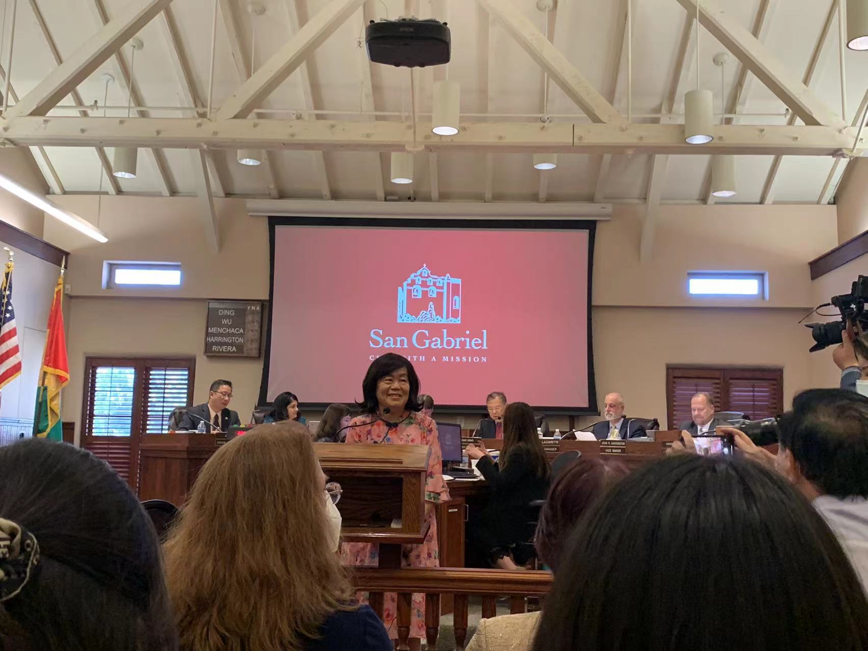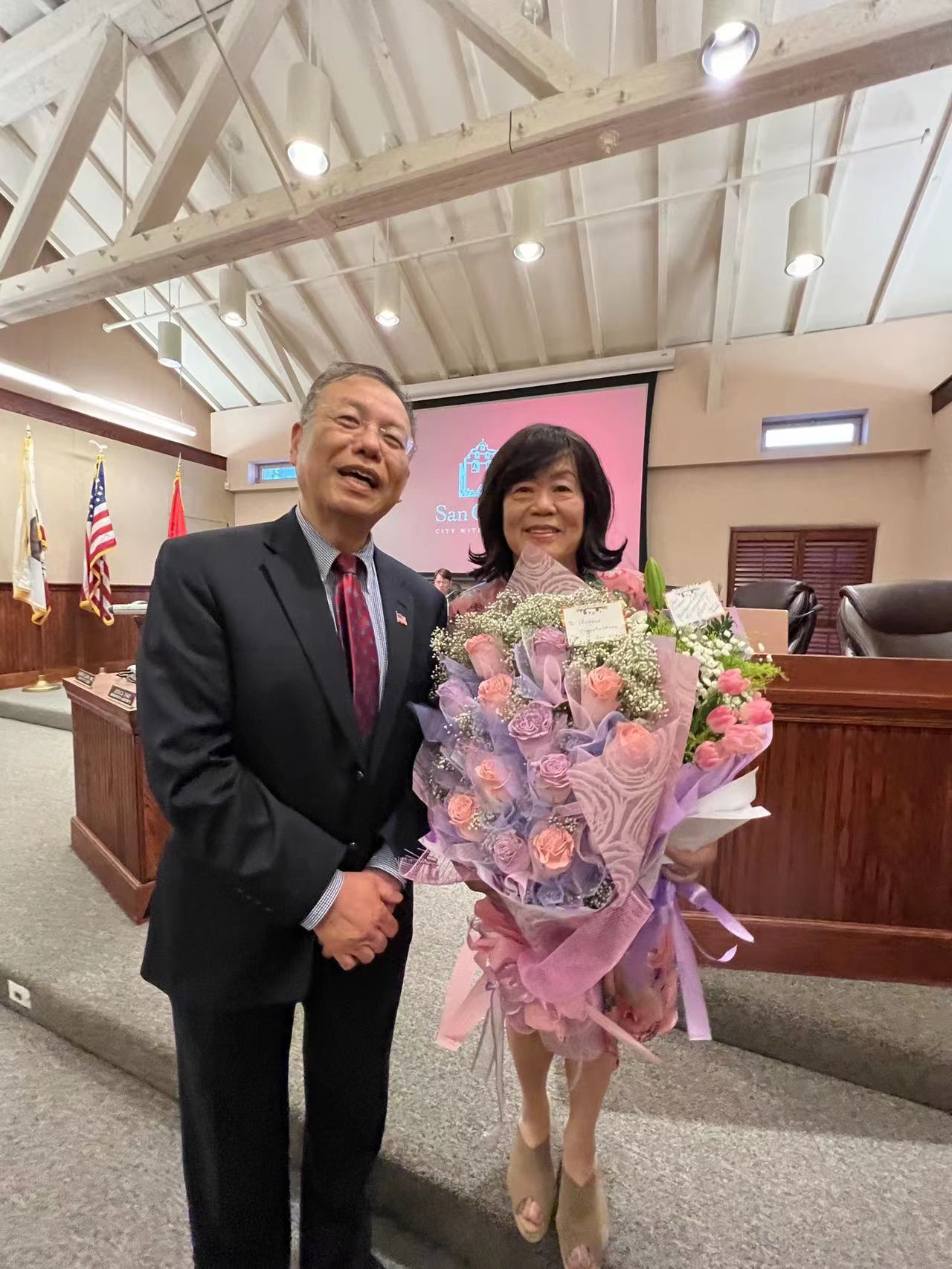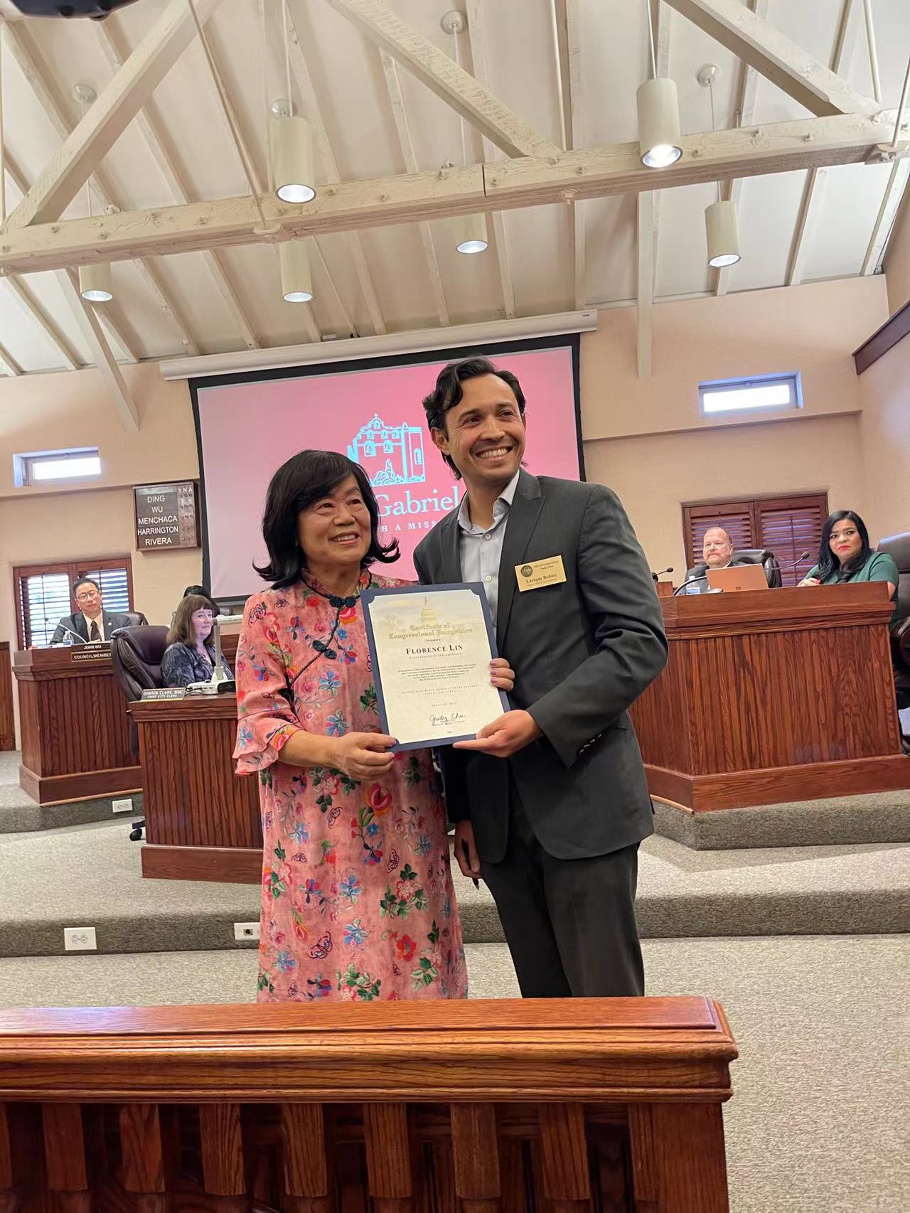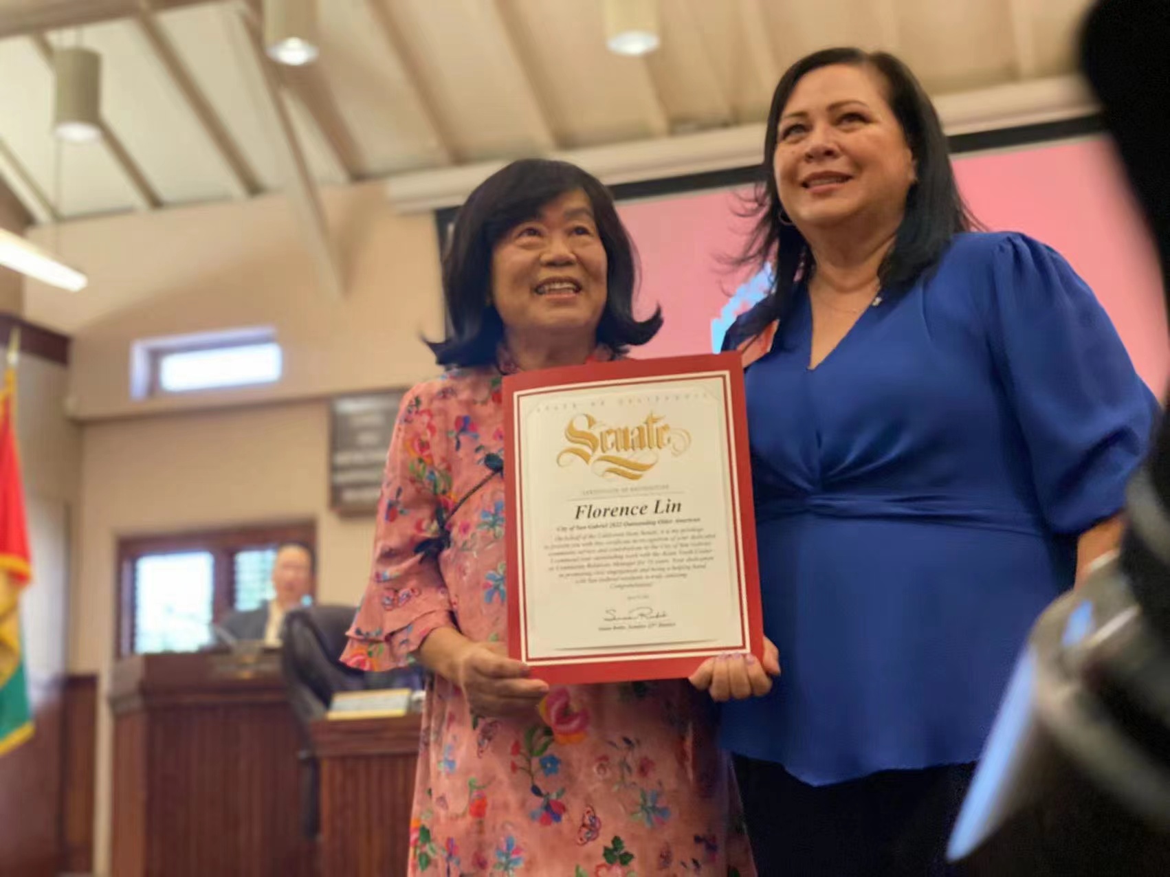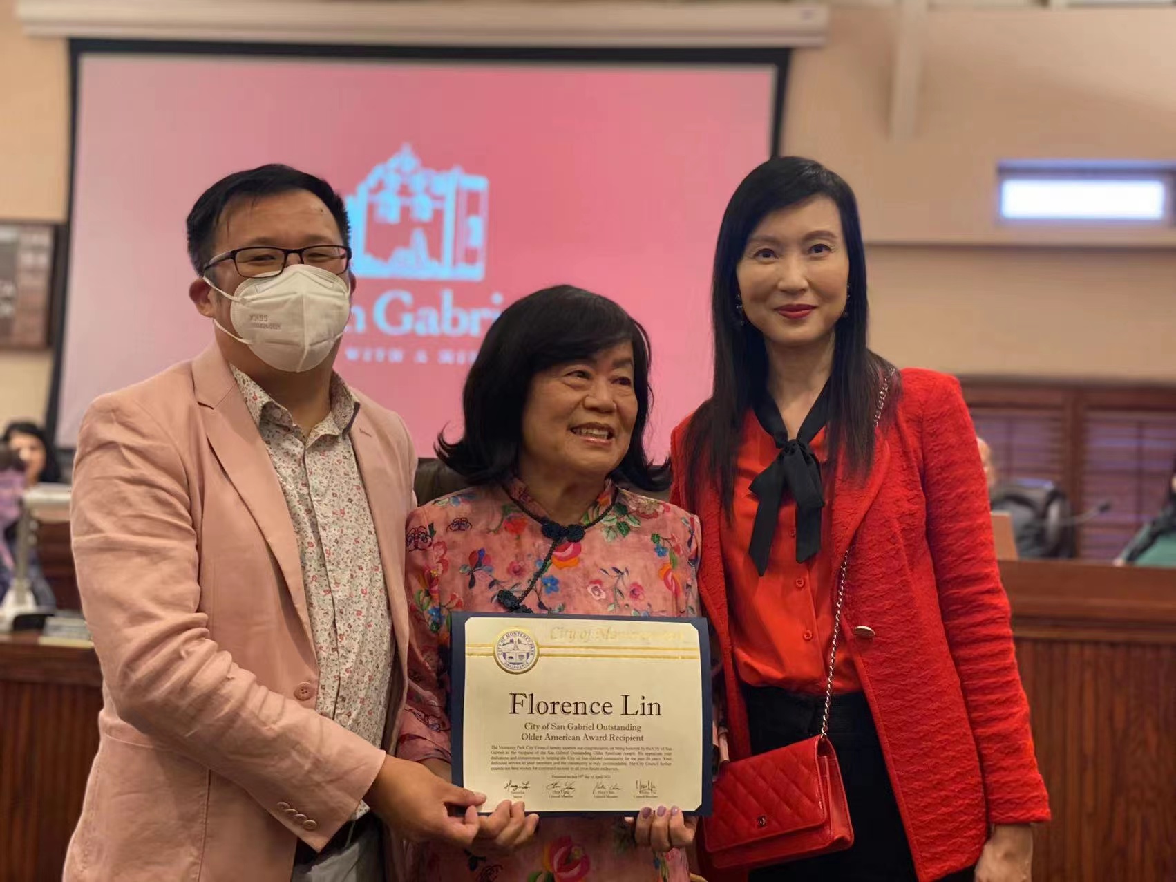 陈凤仪在感言中感谢大家的支持,爱护及鼓励!她也感谢汪老师学院的汪老师及Ormar副校长的推荐,经由San Gabriel Commissioners 及市议员及市政府投票支持!终于在多位优秀人选中脱颖而出成为2022年San Gabriel Outstanding Older American Award 的受奖人!陈凤仪表示,在此与我的亲朋好友分享!十二万分感谢你们一路陪我成长!因为有你们是我的后盾,一本初衷,我将会继续努力服务社区。