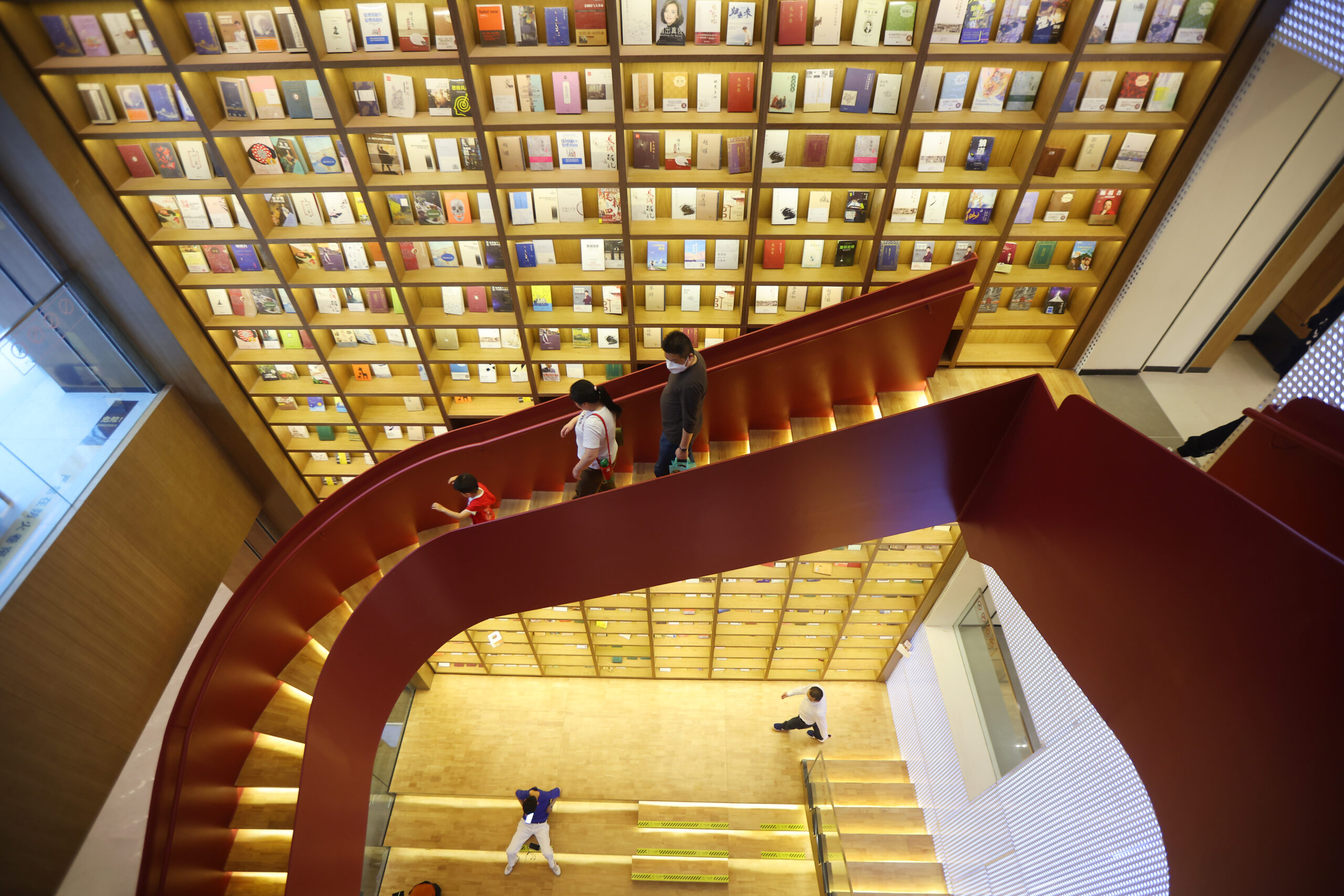 4月22日,江苏南京,设计新颖的锦创书城以创意楼梯、各式风格的阅读区以及琳琅满目的书籍,吸引民众前来阅读,成为当地“网红打卡点”。图为读者从大型书架前的楼梯上走过。