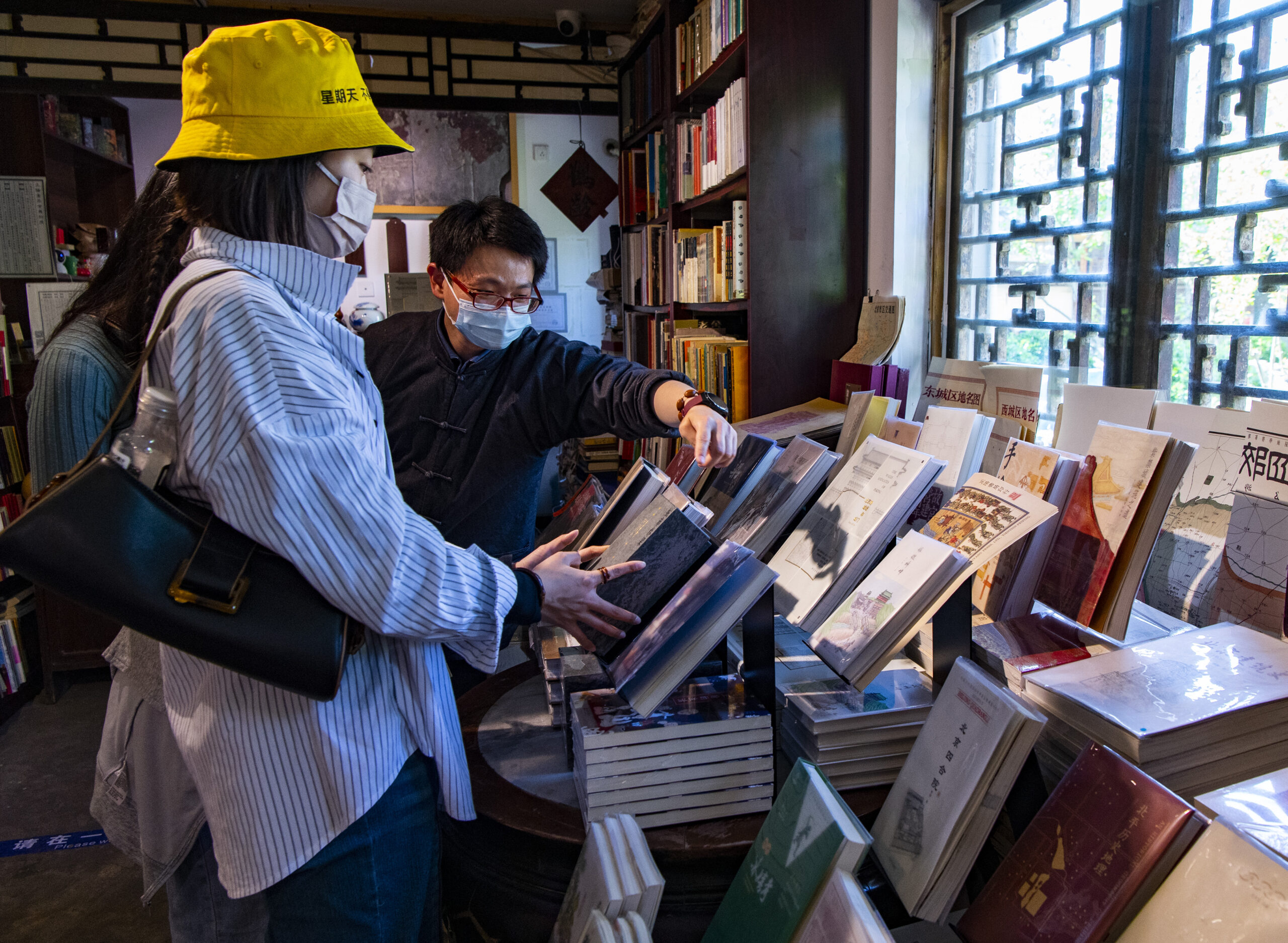 4月22日,“4·23世界读书日”前夕,位于北京市西四砖塔胡同口的正阳书局内,工作人员向读者介绍店内书籍。正阳书局院内环抱一座元代石制的“万松老人塔”,专营北京及老北京相关的文献书籍是该书店的特色。