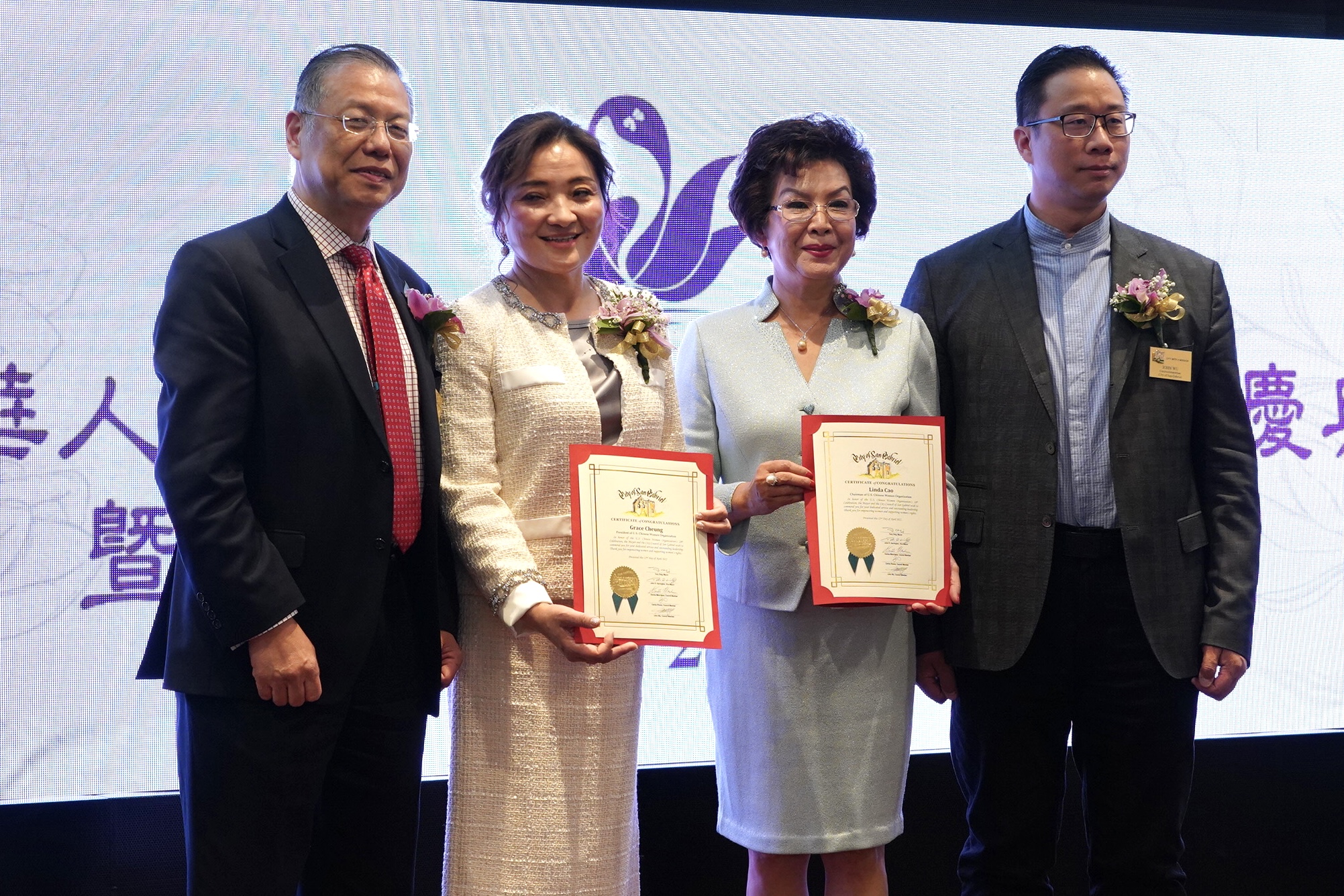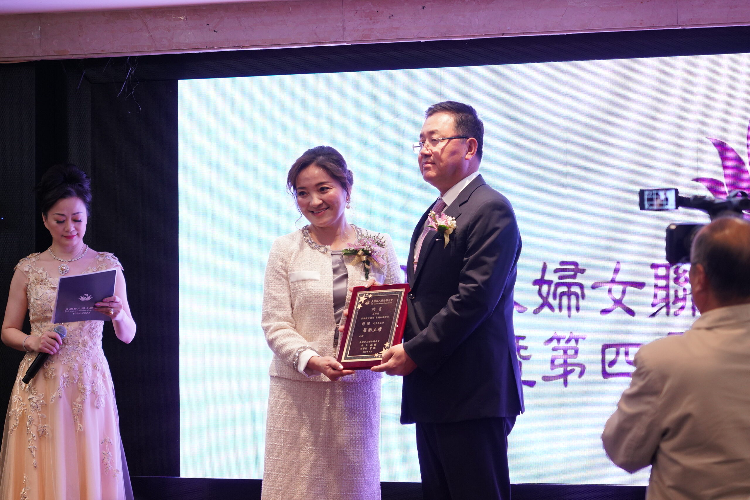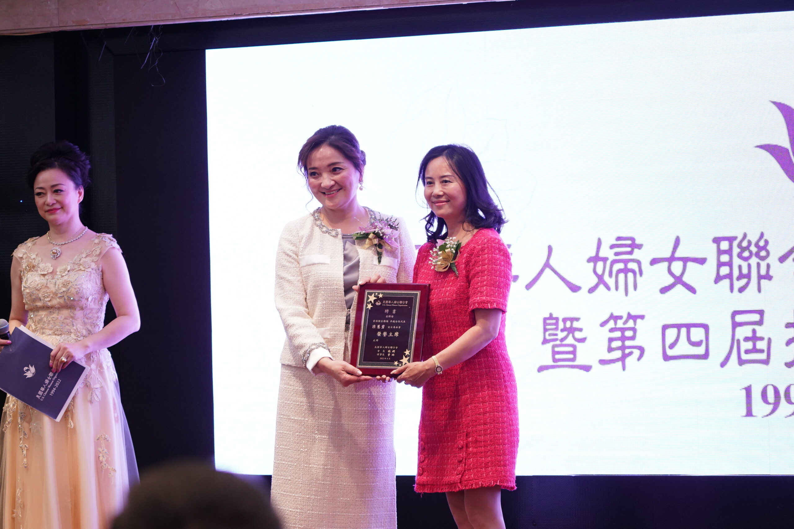 圣盖博市市长丁言愉,市议员吴程远为会长张娴及理事长曹琳颁发贺狀