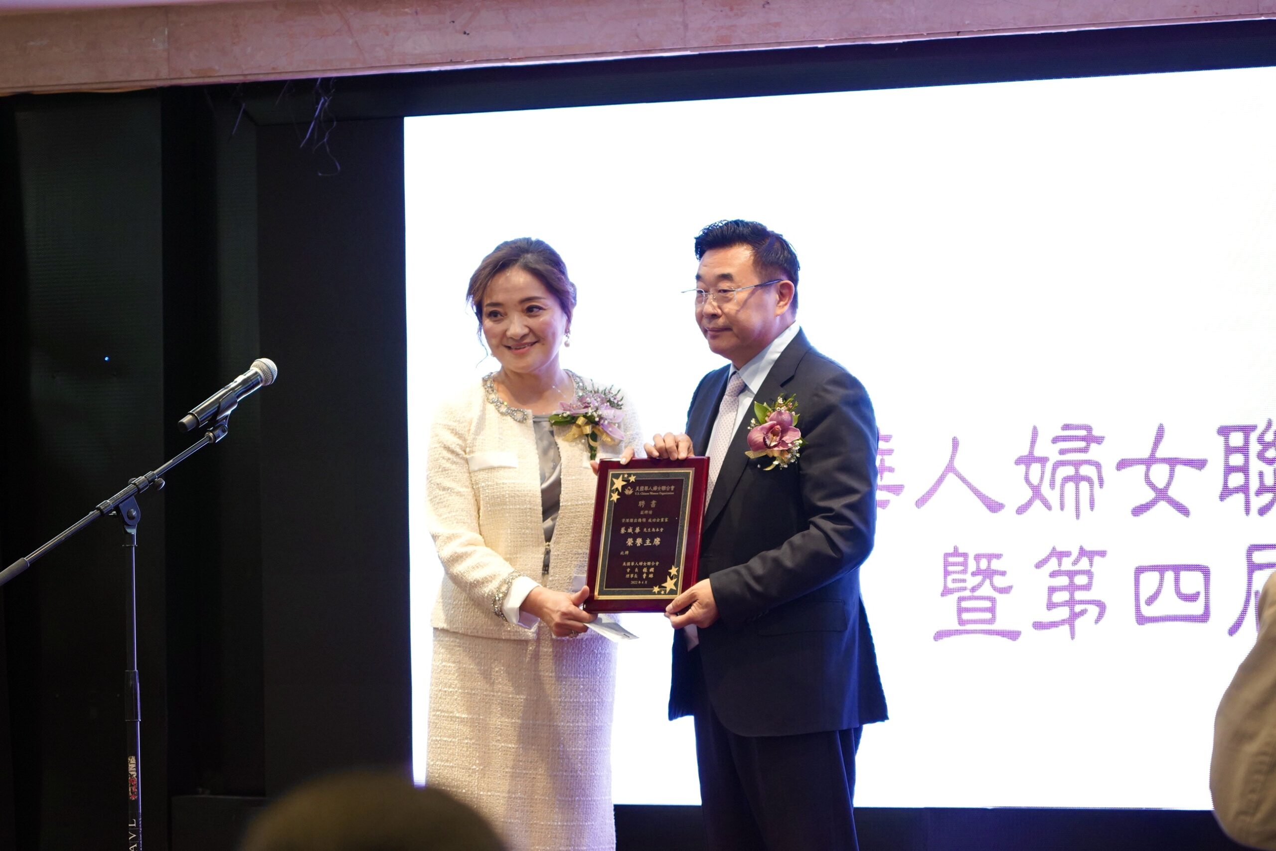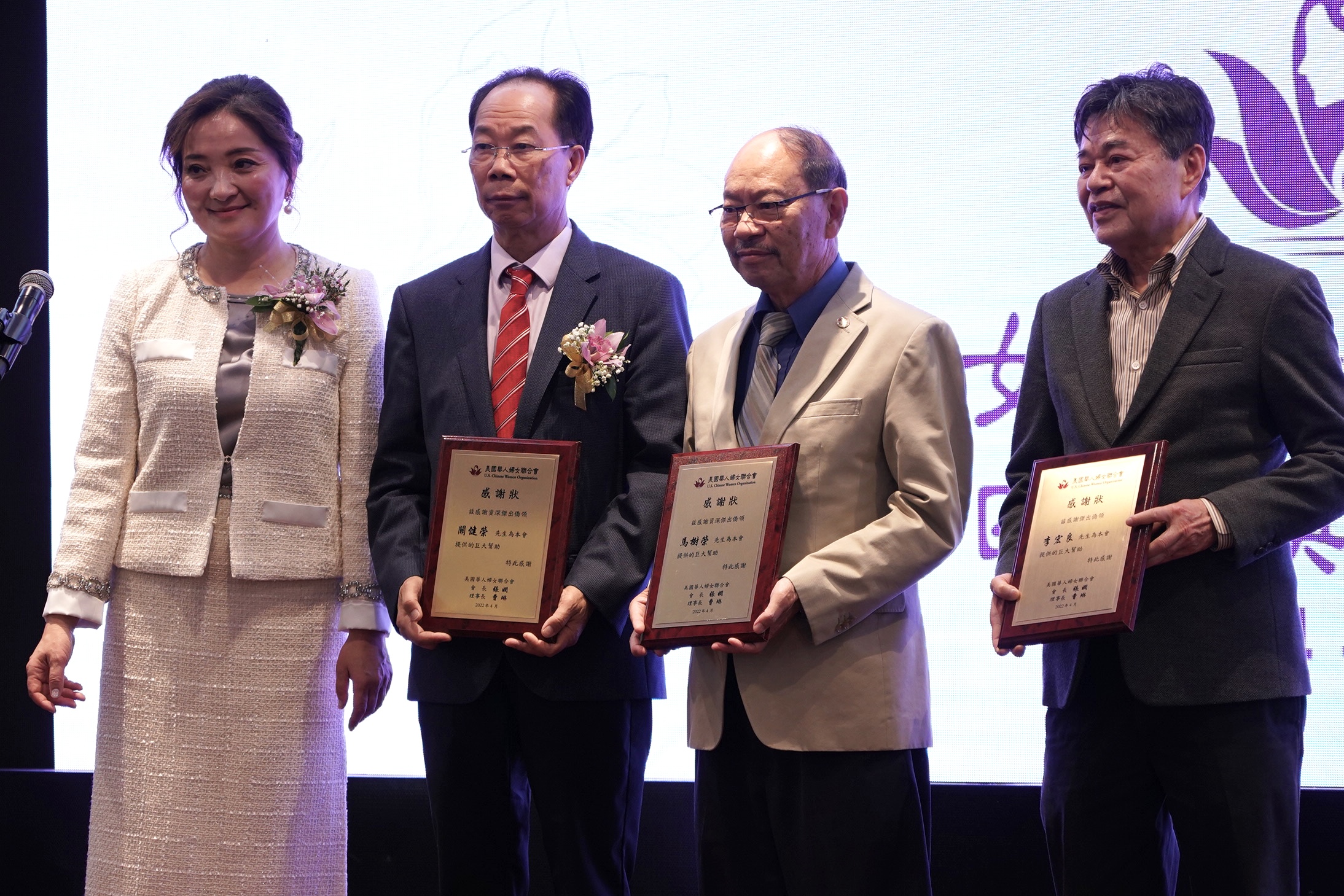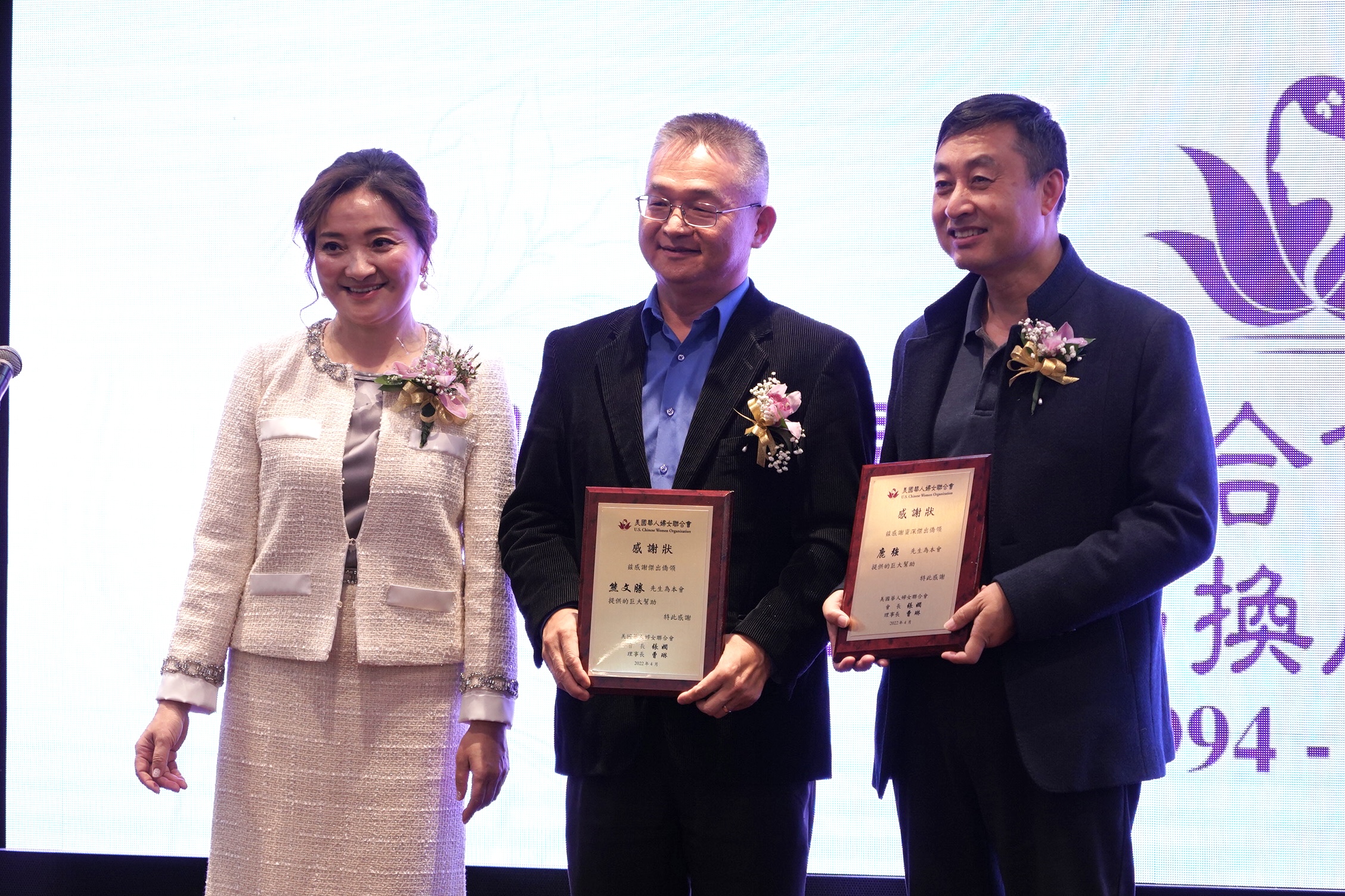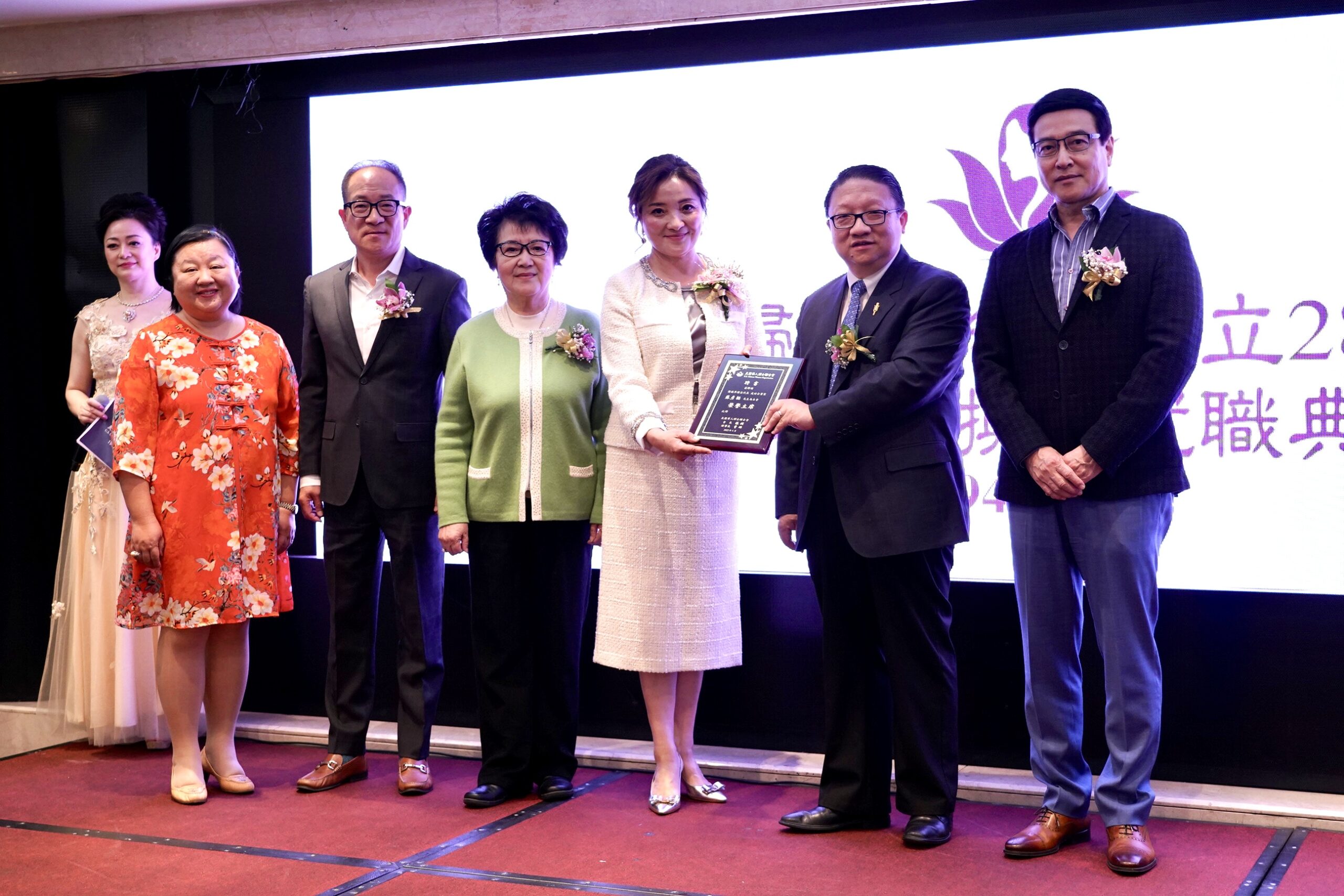圣盖博市市长丁言愉,市议员吴程远为会长张娴及理事长曹琳颁发贺狀