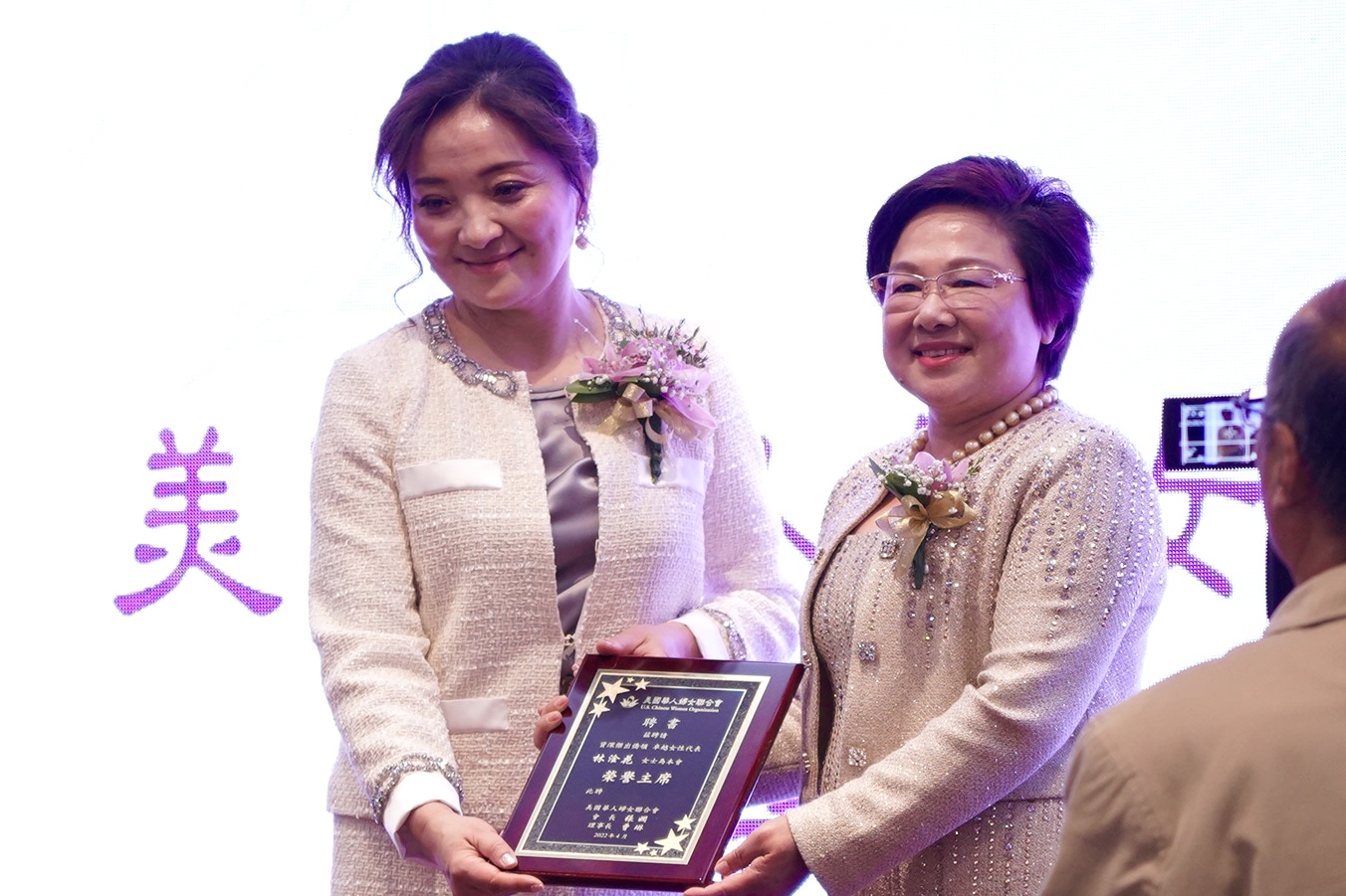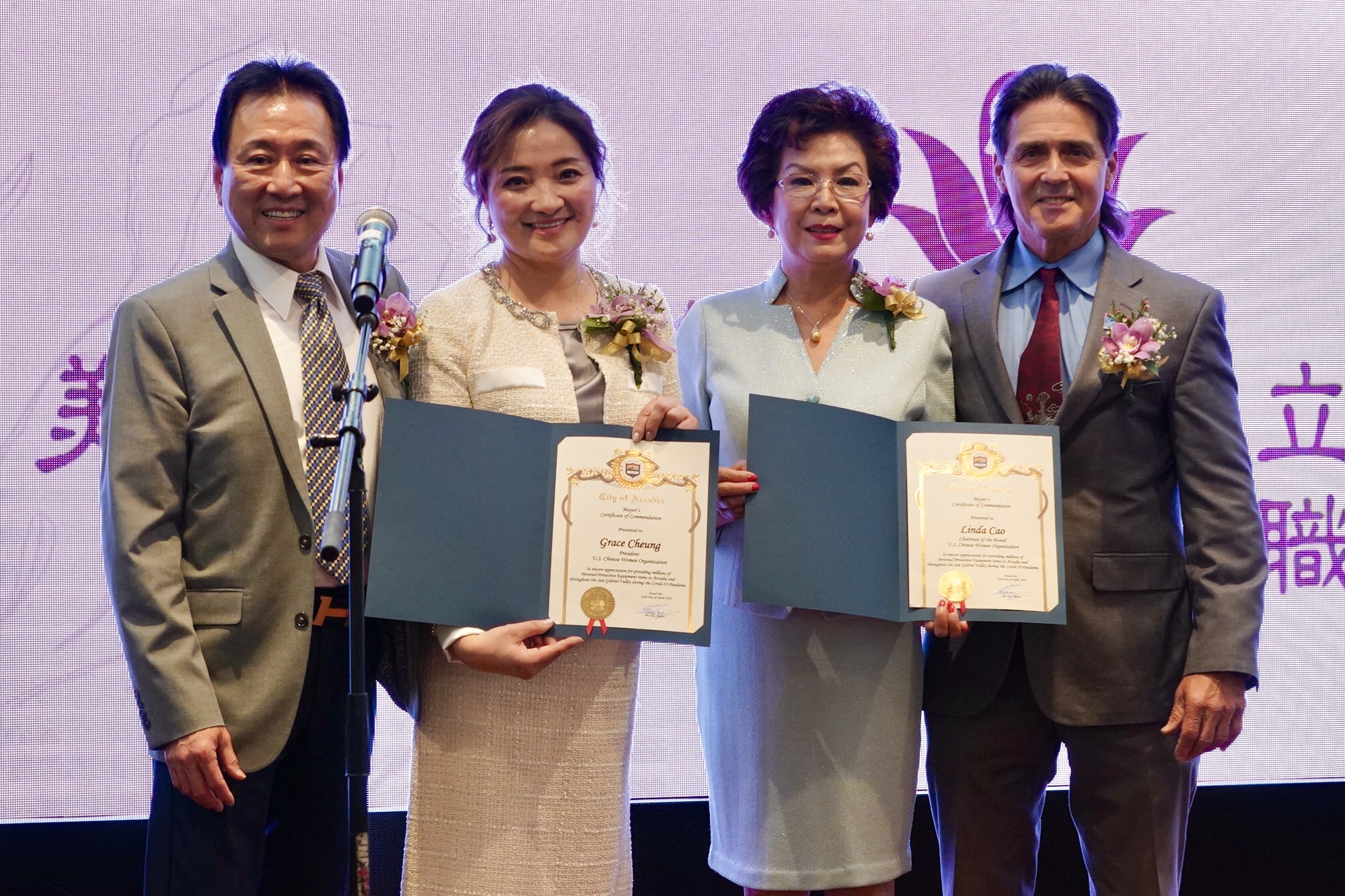 阿凯迪亚市议员戴守真、南帕萨迪纳市市议员麦克为会长张娴及理事长曹琳颁发贺狀