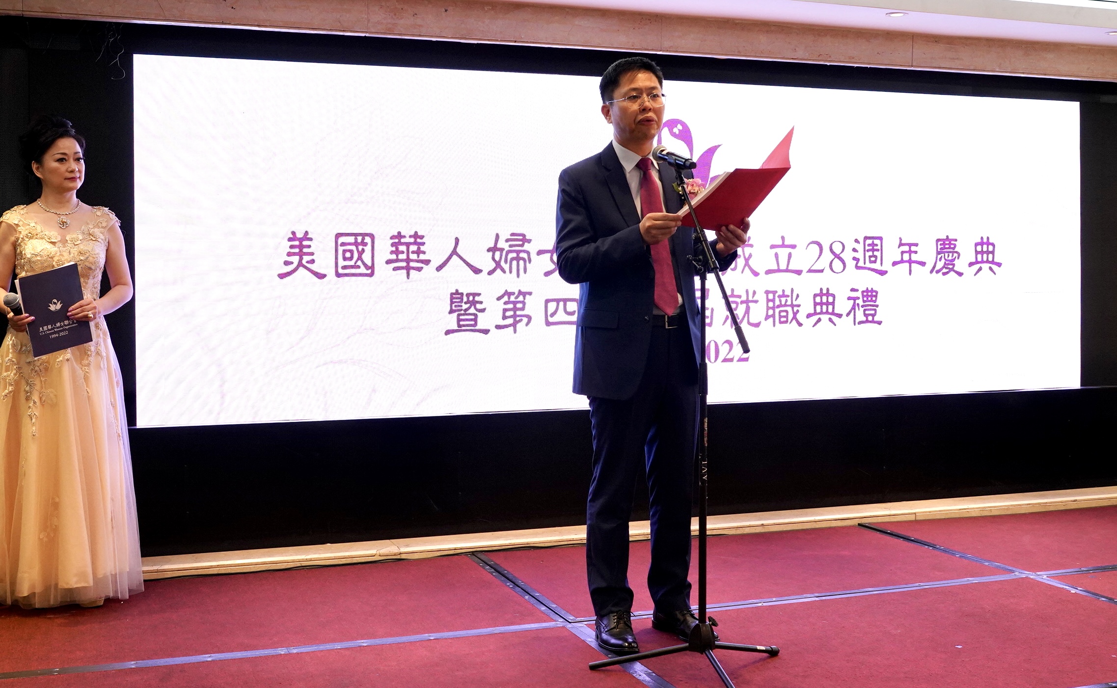日前,美国华人妇女联合会于圣盖博半岛酒店举行成立28周年庆典暨新一届领导班就职仪式。张娴担任新一届妇女会会长一职,驻洛杉矶总领事馆副总领事李春林、侨务主任周咏梅、侨务领事路君燮、圣盖博市市长丁言愉,市议员吴程远、阿凯迪亚市议员戴守真、南帕萨迪纳市市议员麦克、蒙市前市长林达坚等民选官员,美侨总会长蔡成华、共同会长徐晓峰、美华联主席陈慧碧、理事长郭颂、监事长赵林、荣誉主席张素久,鹿强、美华总会长邵闻、理事长熊文胜、监事长于泽伟、美侨联主席关健荣、理事长马树荣、美国华人社团大联盟主席林淦花、鹰龙传媒董事长、美国上海联谊会会长苏彦韬,鹰龙传媒总经理苏林淑婷、美中工商总会会长张勇等侨界代表及商界人士200人出席活动。