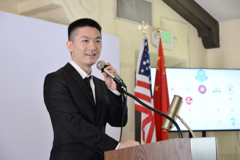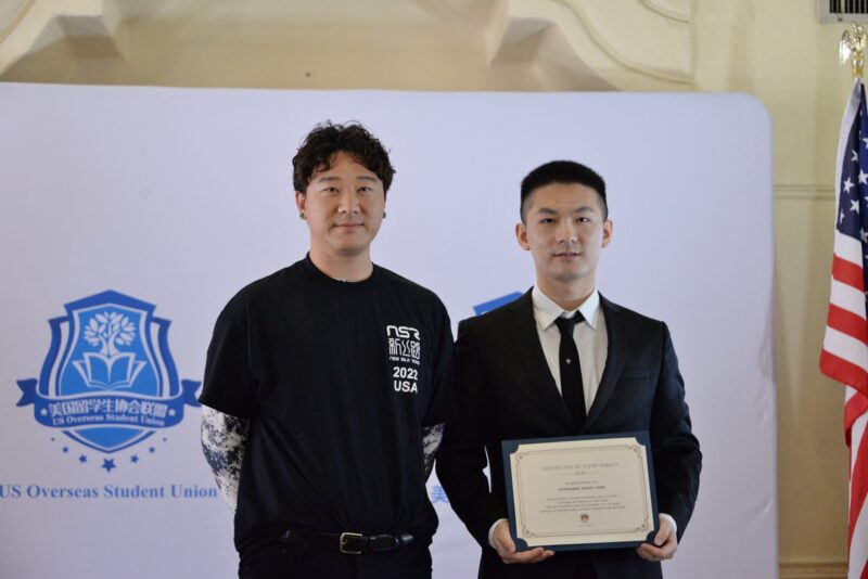 中美戏剧联盟代表Jimmy向美国内蒙古留学生协会主席方子豪颁贺状