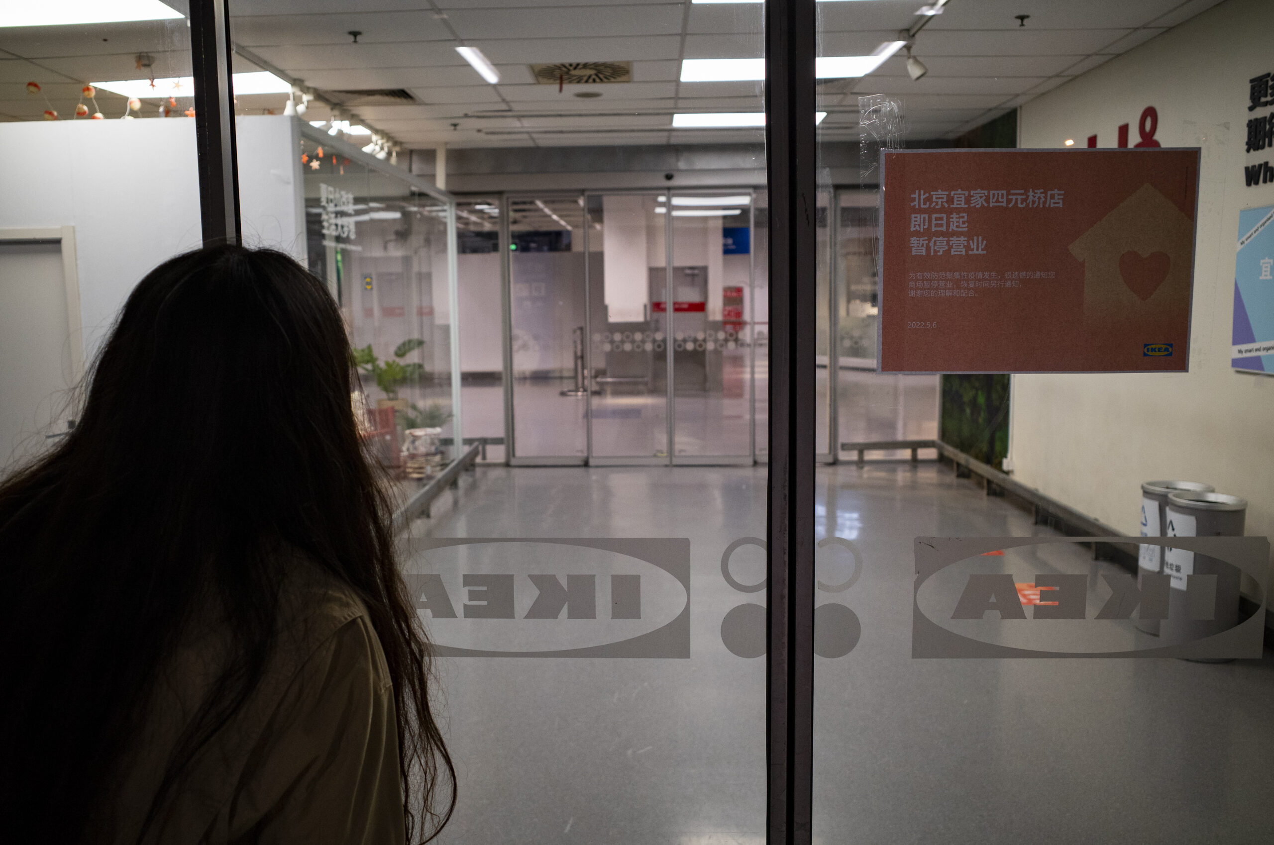 5月6日晚间,依照北京市疫情防控政策,宜家北京四元桥商场当天起暂停营业。图为一位市民在宜家门外查看商场情形。