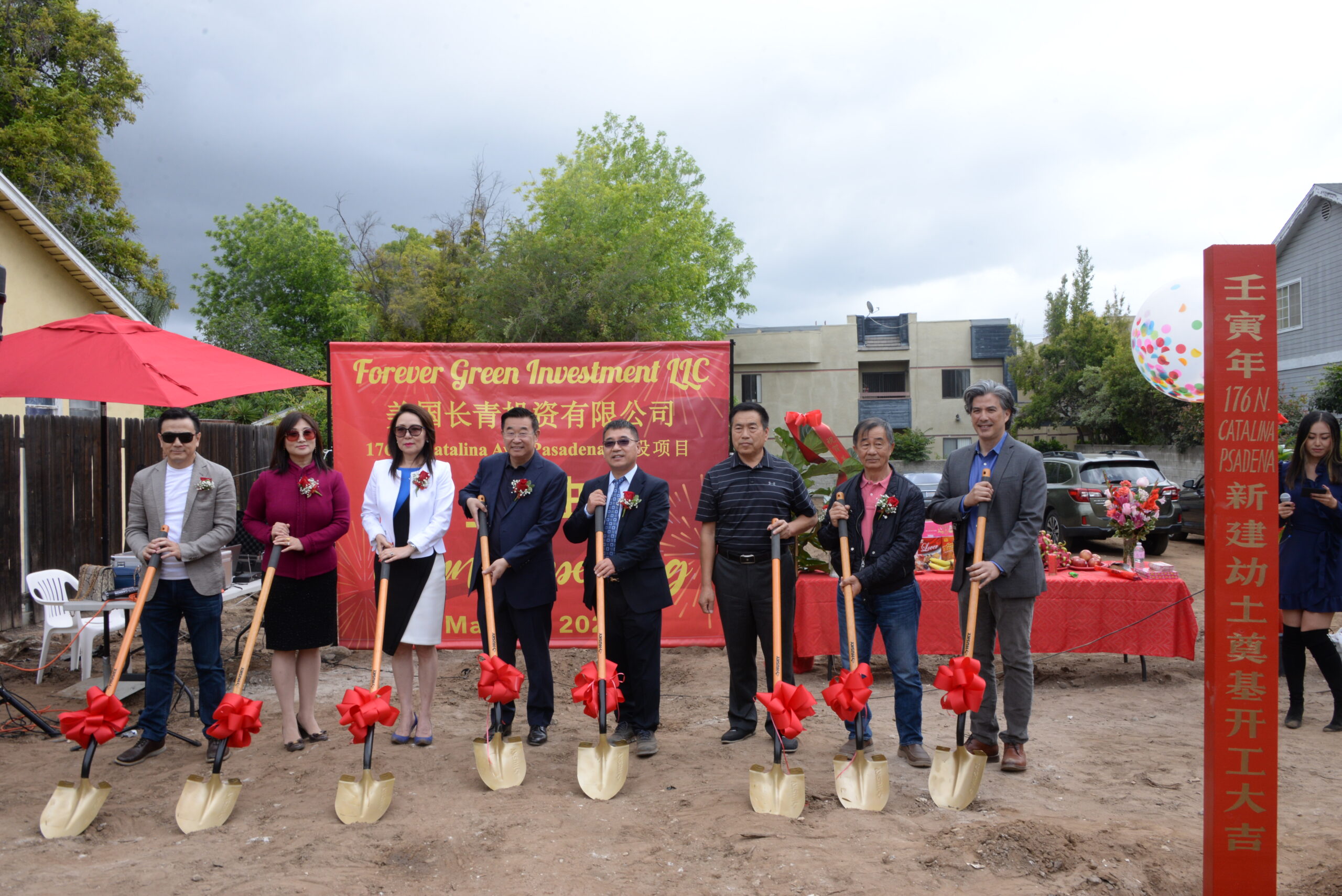 城市新闻5月8日帕萨迪纳报道,美国长青投资集团首个建筑投资项目-卡特琳娜连排康斗在帕萨迪纳隆重举行动土奠基开工仪式,这是美国长青投资集团在美国扩大商业版图的又一成功标志。美国长青投资集团董事长潘长青、美国南加州华人华侨联合总会会长蔡成华、美国江苏总商会执会长徐晓峰、美国营建公会会长姜晓东、全美浙江总商会会长林光、美西无锡商会理事长邹志明、著名律师李红、伟德建筑工程负责人黄学养、美国长青投资集团合伙人叶龙、美国第一銀行贷款专家林昆蓉、美国南加州吕氏宗亲联谊会会长吕芳哲、美国时代广场广告传媒公司总经理马嵘乔等社区代表参加,庄子主持活动。
