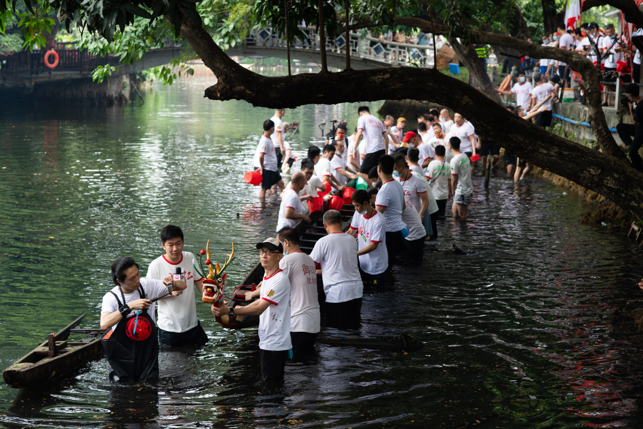 5月27日,第十二届“荔枝湾·新西关”民俗文化活动——“五月五·龙船鼓”暨“我们的节日·端午”线上活动在广州荔枝湾举行。活动当日,龙舟习俗在荔湾湖畔上演,其中起龙仪式包括祈福、起龙船、清洗装饰龙船和试扒龙舟等环节。图为起龙船、安装龙头环节。