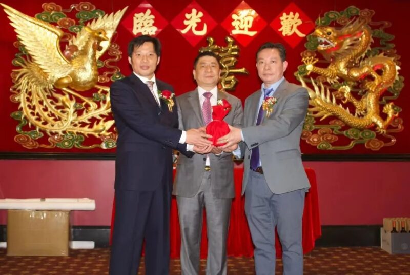 美国华人华侨联合总会主席林建新(中)监交下麻州分会会长谢锋(右)走马上任