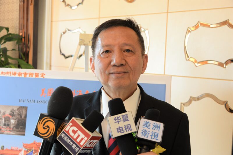南加州海南会馆监事长潘正桐接受各大媒体记者访问