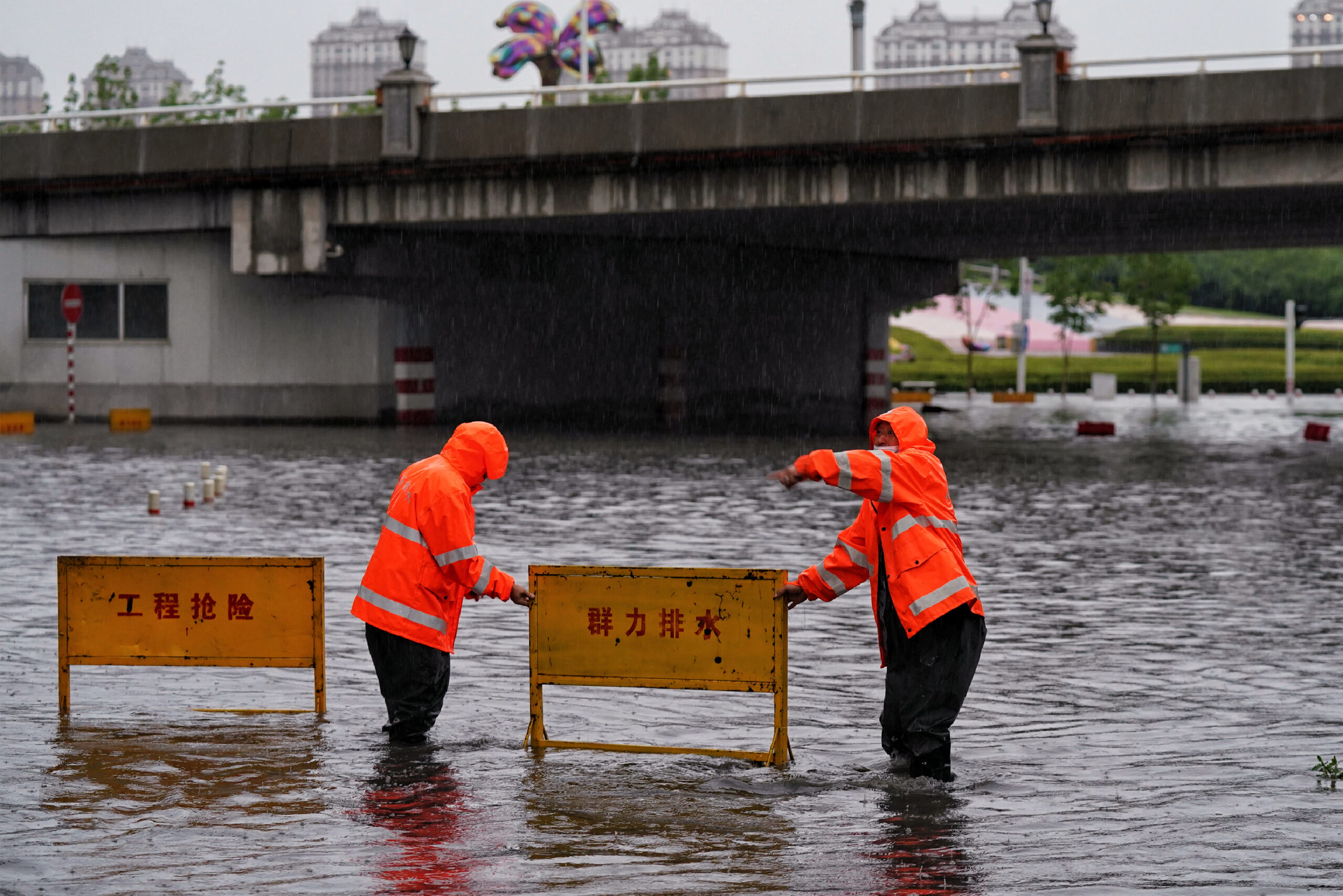 6月16日,哈尔滨市道里区群力大道,抢险人员在积水过深处放置围挡和警示牌。当日,哈尔滨市气象台16时30分升级发布暴雨橙色预警信号。哈尔滨市市内多条道路因暴雨导致内涝积水。