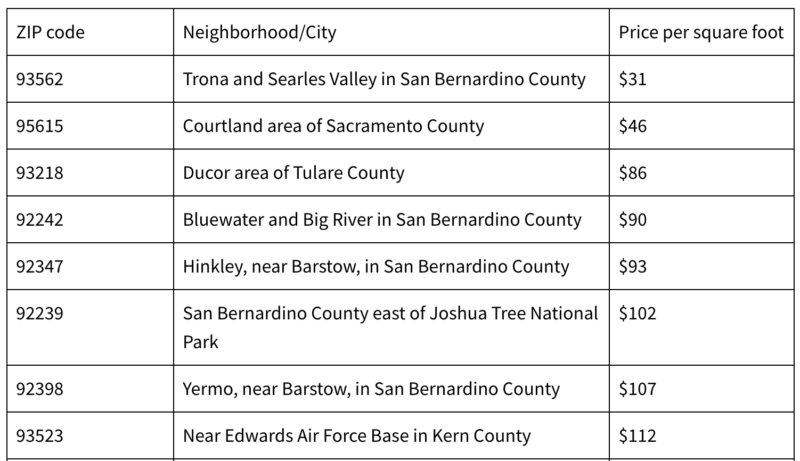 数据显示,中央山谷和远北加州有几十个社区的房屋售价在每平方英尺 150 美元到 250 美元之间。南加州的圣贝纳迪诺县和萨克拉门托的某些地区仍然有一些地方的价格甚至更低。每平方英尺最便宜的价格可以在 93562 找到,其中包括圣贝纳迪诺县的 Trona 沙漠社区。在 2022 年 2 月至4 月期间的数据,Trona 邮政编码中每平方英尺的平均售价仅为 31 美元。Trona 在 2019 年遭受了一系列非常强烈的地震的重创,包括 7.1 级地震,但仍未从对房屋和企业的破坏中恢复过来。