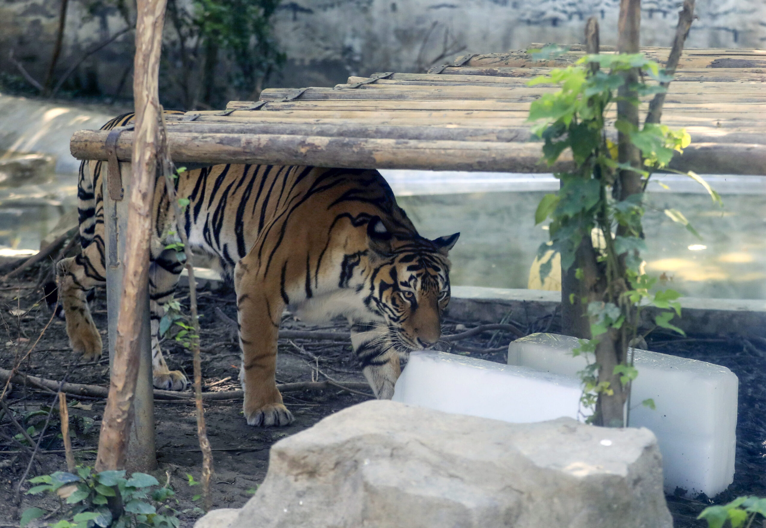 7月6日,四川成都动物园,一只老虎贴近冰块感受凉意。当日,成都市高温天气持续。