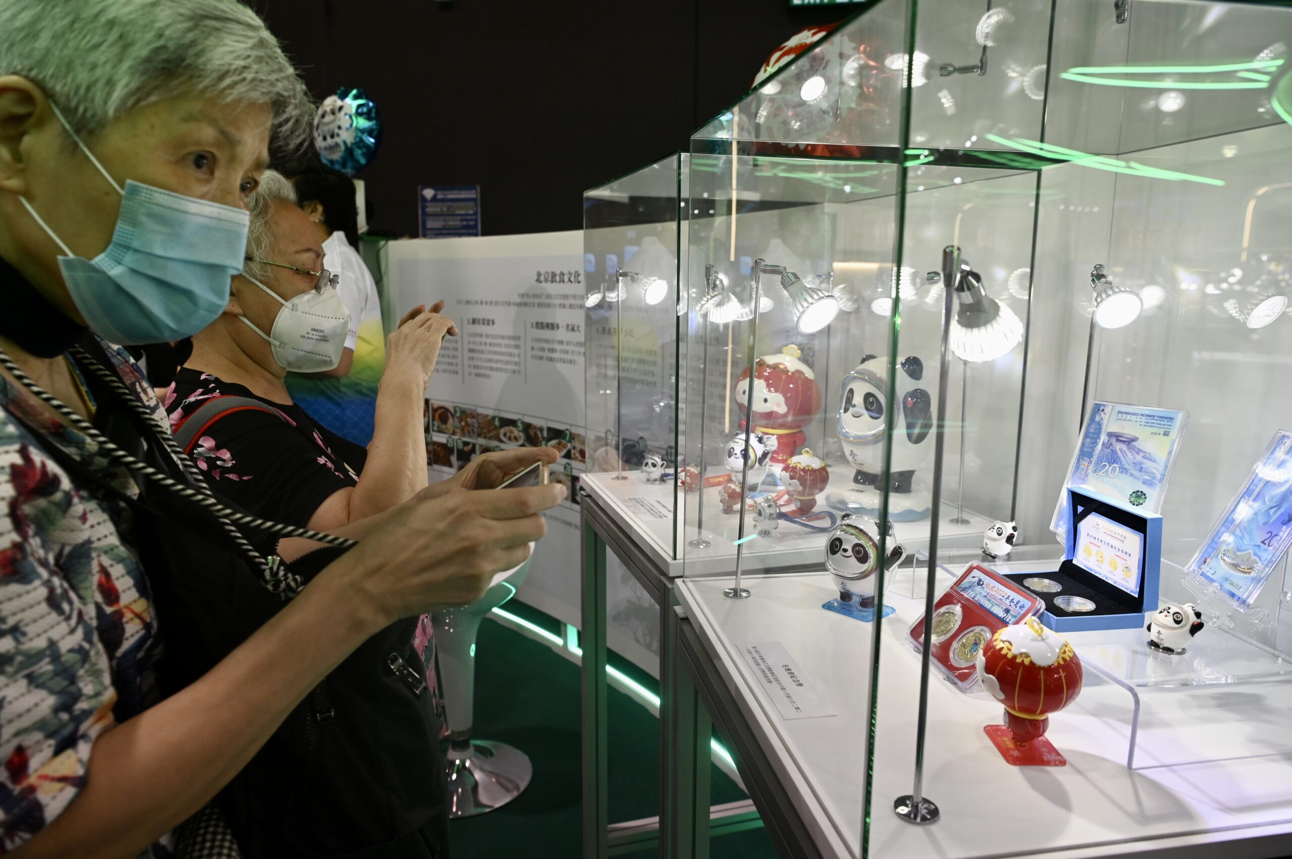 7月7日,香港市民到香港会议展览中心参观“同乡文化名胜展”,认识中国内地各地方的名胜古迹、风土人情、历史文化。图为市民驻足观赏北京冬奥会吉祥物“冰墩墩”、北京冬残奥会吉祥物“雪容融”等纪念品。