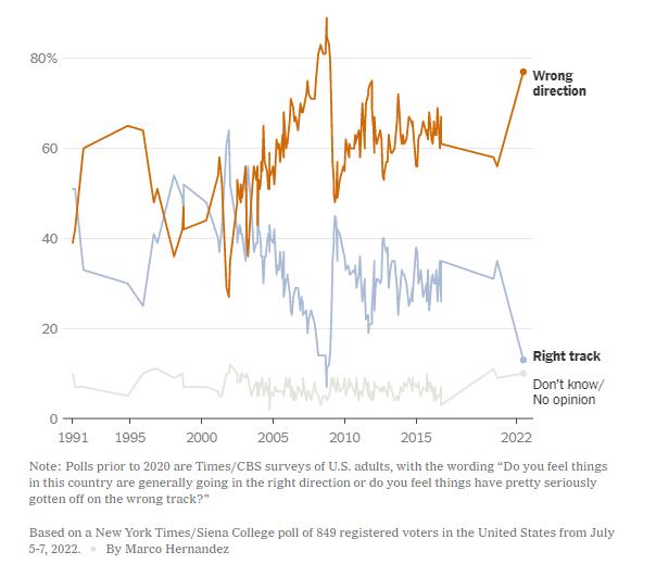 7月11日,《泰晤士报》将发布其对 2022 年中期竞选的首次民意调查。其中一个主要信息是,美国人似乎又像2016年那样对主要候选人不满意了。“这感觉像是 2016 年的民意调查,而不是 2020 年的民意调查,”《纽约时报》首席政治分析师内特-科恩(Nate Cohn)表示。