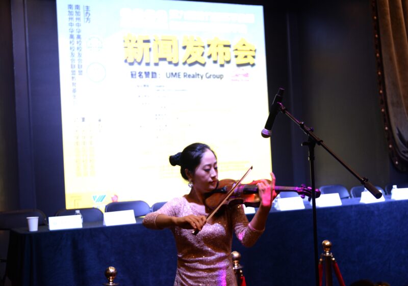 赞助商和校友会代表先后发言,嘉宾们简单介绍了各自的企业与业务范围,分享了自己与奖助学金项目结缘的故事,充分肯定了高校联盟该慈善项目的巨大社会意义,表达了对奖助学金项目的大力支持与殷切期望。组委会感谢各赞助方的认可、支持与鼓励,并表示将赞助款项充分用于本届获奖学生的奖励上,主要用于増加奖励人数,进一步提高这一南加州地区最富有影响力的、覆盖范围最广的综合教育慈善项目,从而进一步增强华裔的社会影响力。发布会前沁妤演奏小提琴《查尔达斯舞曲》。