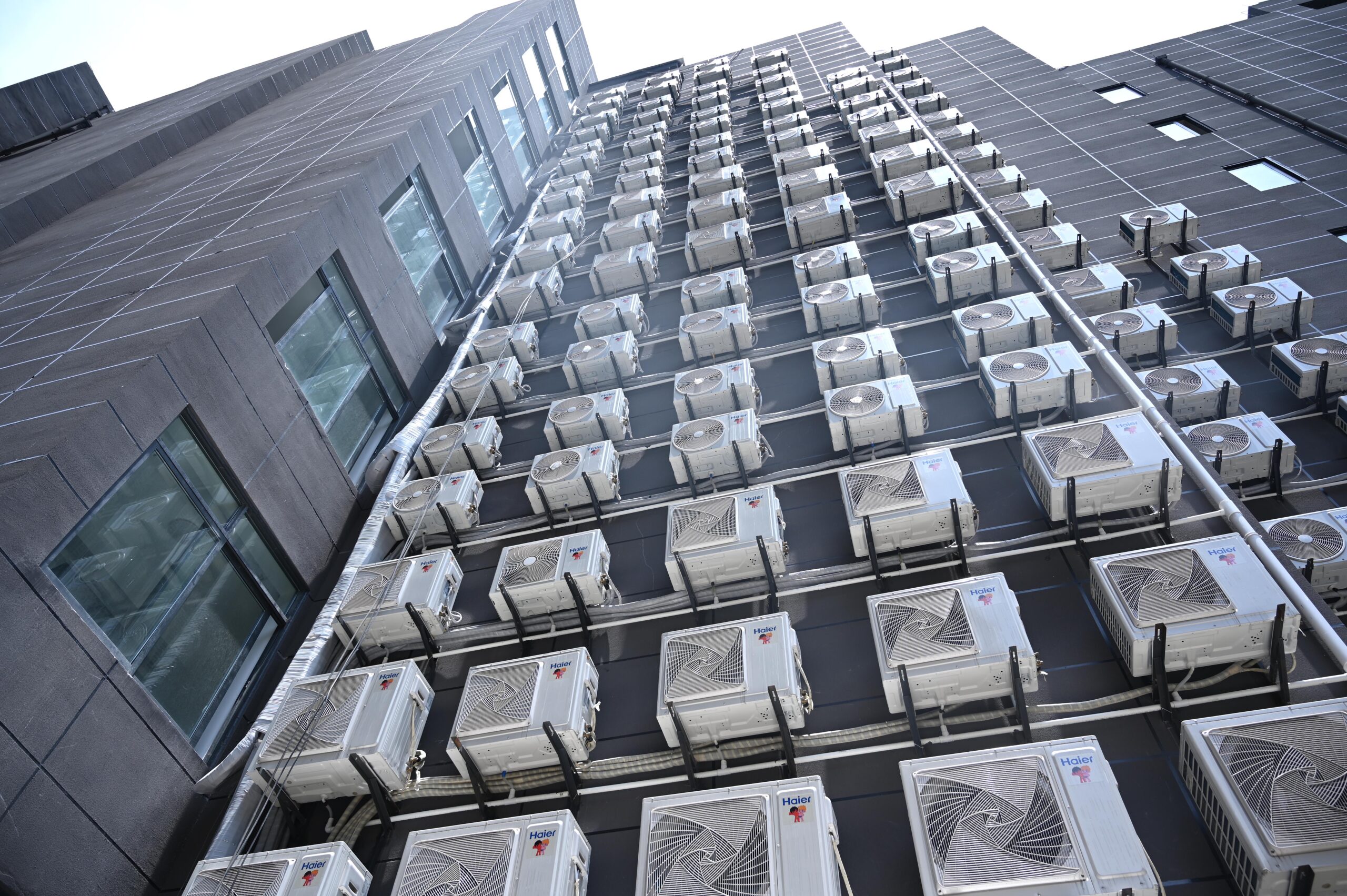 7月12日,重庆街头,一高楼外墙上挂了100多个空调外机。