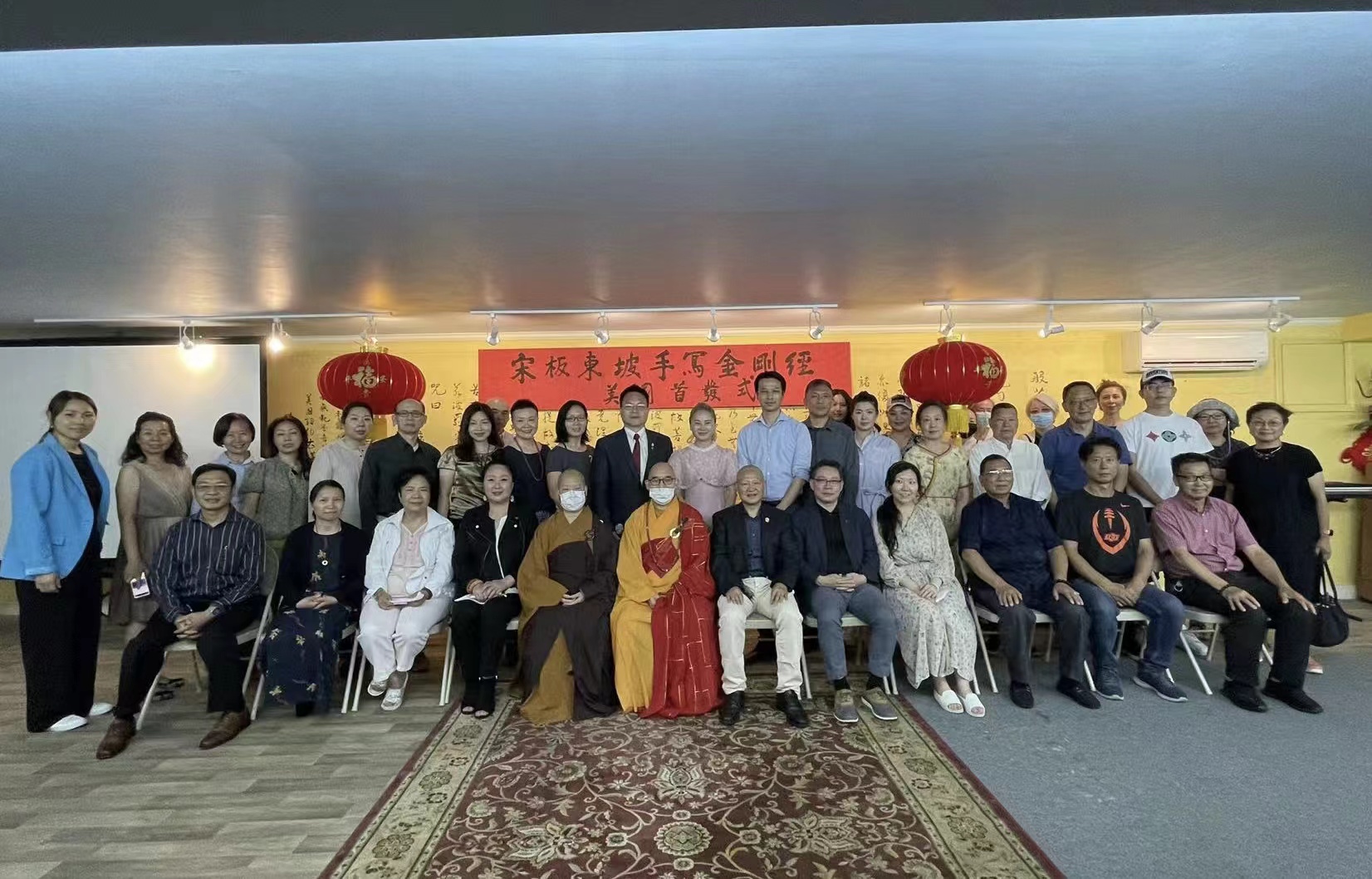 【美国城市新闻网驻纽约记者石泉报道】当地时间 7月9日,由国际华严会主办《宋板东坡手写金刚经》在美国纽约举办首发式,美国佛教联合会会长明予法师、副会长净义法师,纽约市市长亚当斯亚裔高级顾问郑祺蓉女士、美国华人华侨联合总会共同主席、麻州分会主席谢锋以及来自纽约、波士顿、费城、新泽西、康州等多个地方的佛教、书画人士近百人参加。活动之前先进行了诵经祈福洒净仪式,随后举行了剪彩、赠书等。活动由朱立业主持。