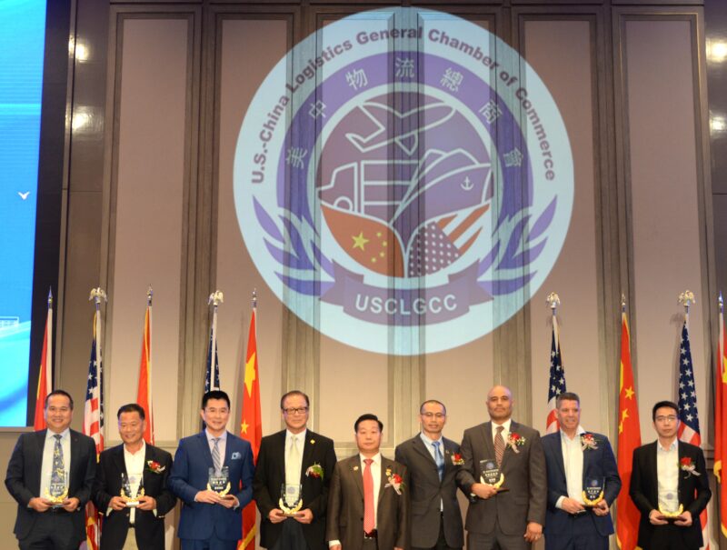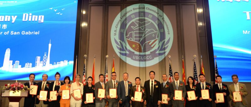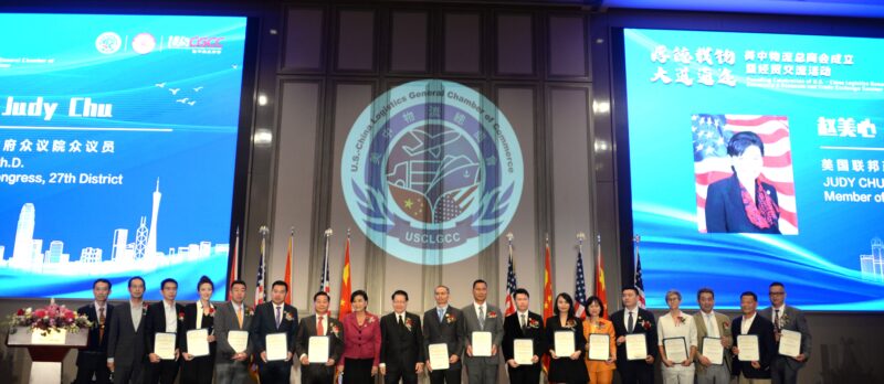 美国国会议员赵美心向美中物流总商会成员颁贺状,左起:郭刚、夏启刚、梁粤辉、王明明、石玉峰、谢少华、张铁流、国会议员赵美心、伍国庆,右起:朱立彬、李偉、陈楚华、ANNA Yu、王泓凯、何雪清、吴佳琳、林东杰、赖凯文、帅勇