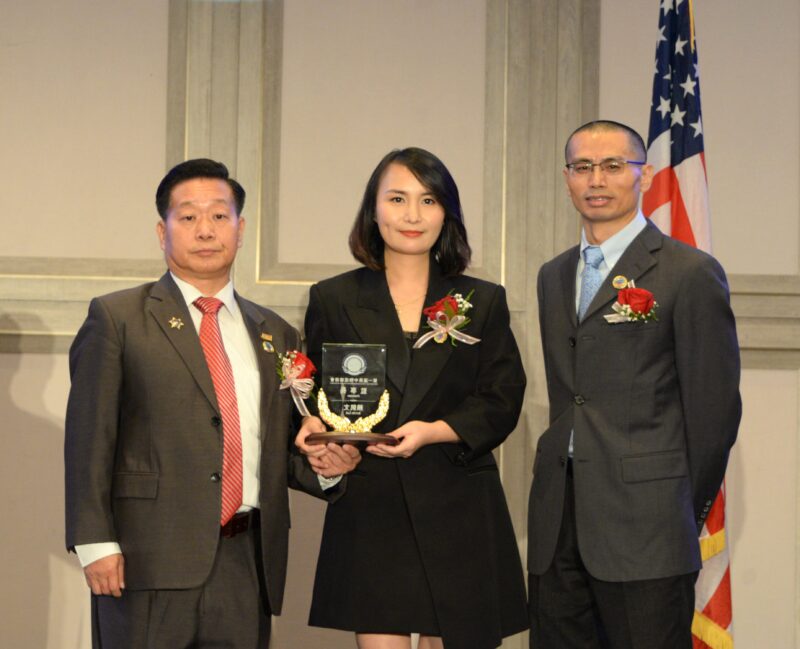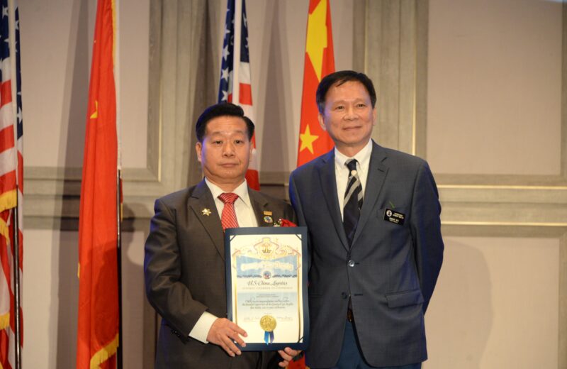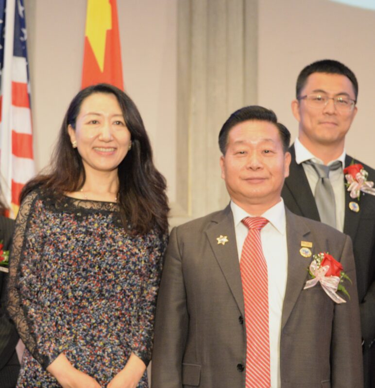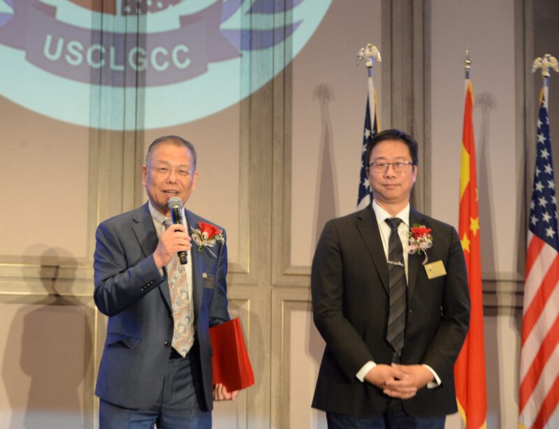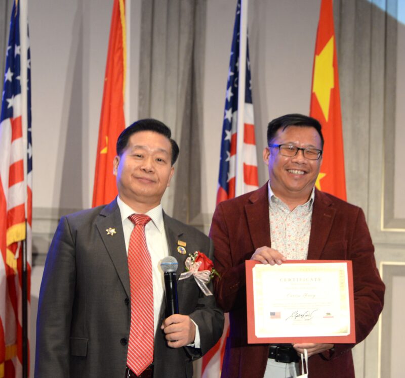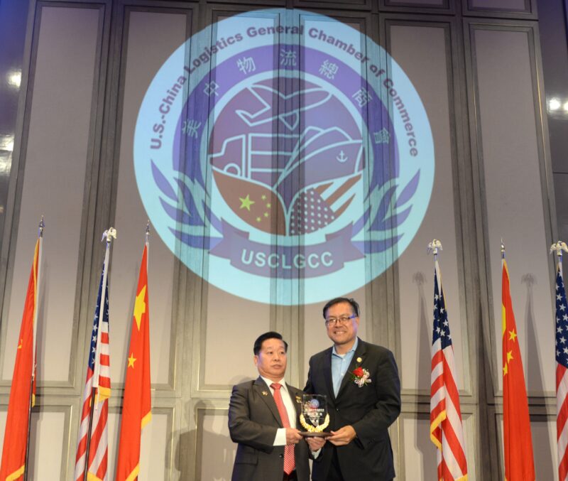 加州众议员方树强向美中物流总商会创会会长张铁流頒任職牌