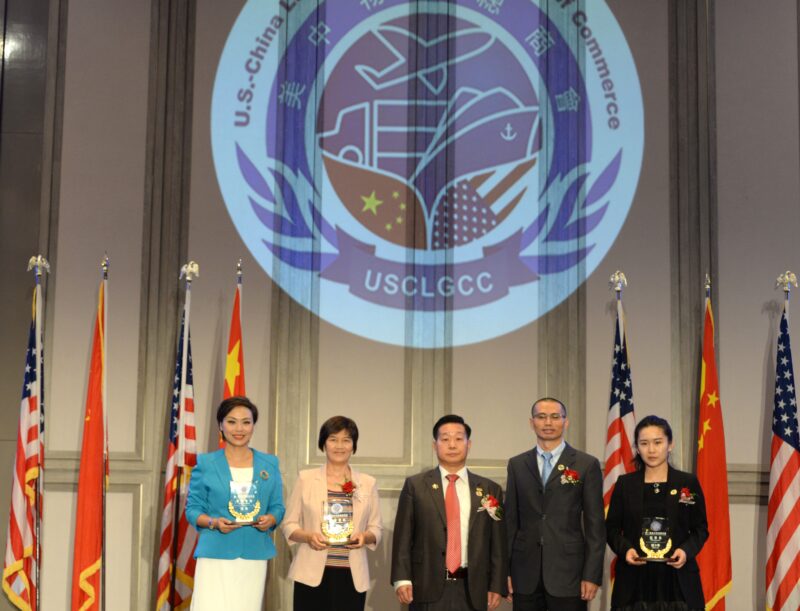 左起:美中物流总商会副秘书长刘玮、黄有莉秘书长、张铁流会长、帅勇执行会长、张丽媛行政部长