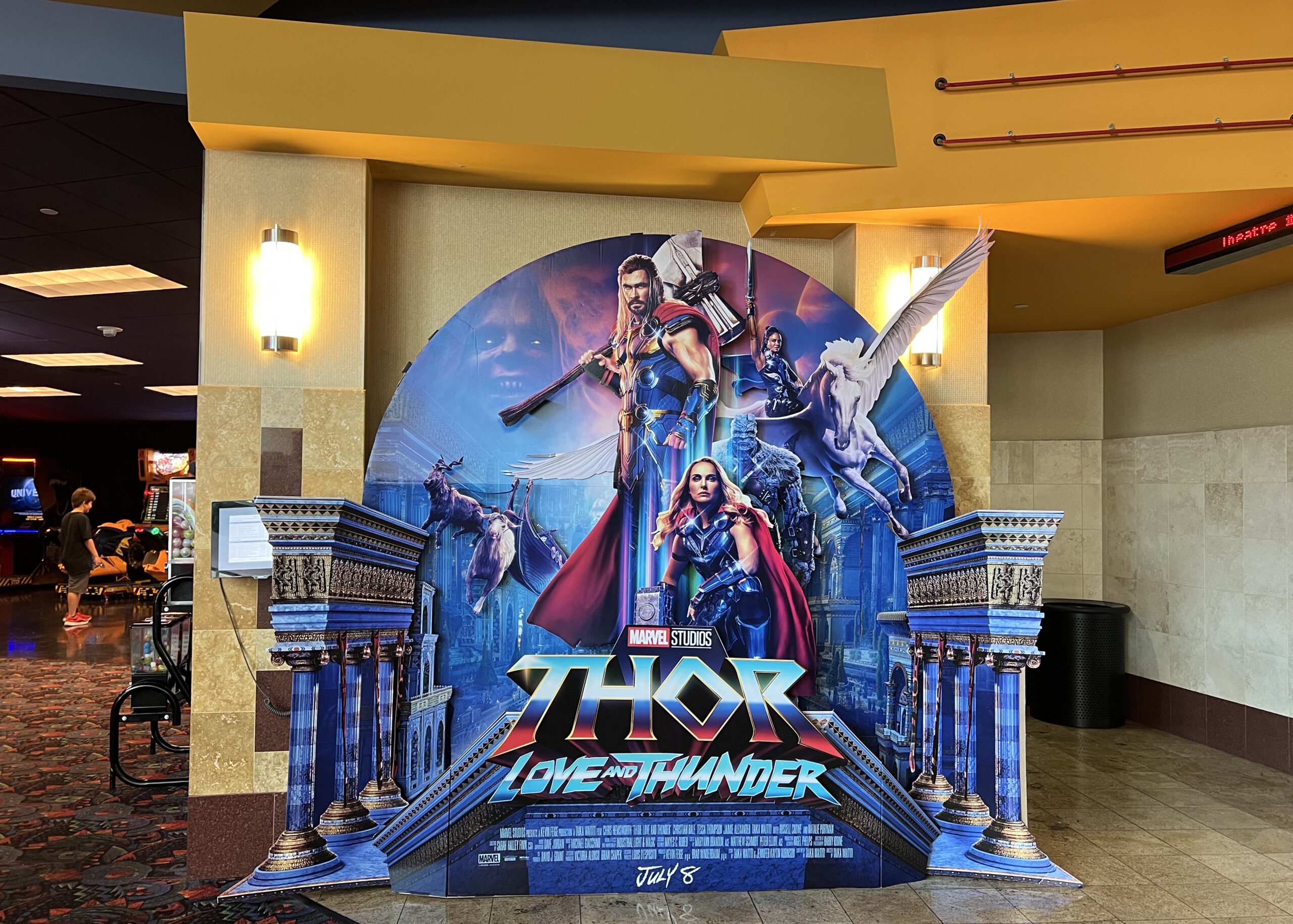 7月17日统计数据显示,漫威最新奇幻冒险动作片《雷神4:爱与雷霆》(Thor:Love and Thunder)蝉联北美周末票房排行榜榜首,全球票房突破7亿美元。图为美国加利福尼亚州洛杉矶一家电影院内摆放着该片大幅立体海报。
