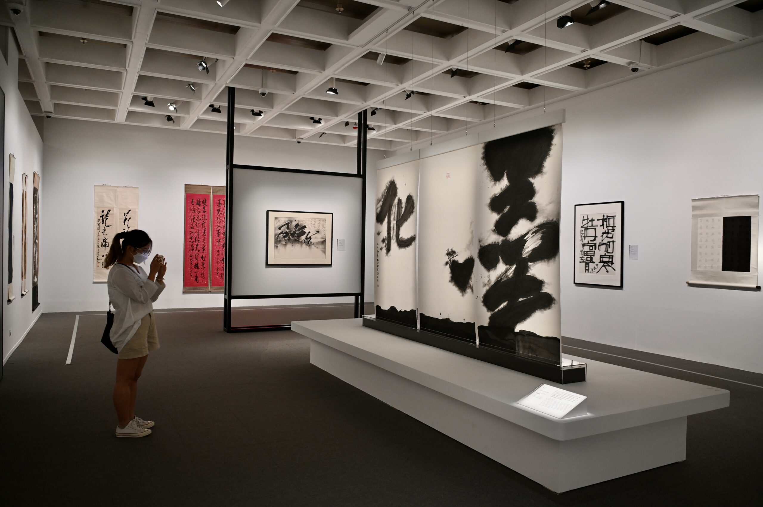 7月21日,香港艺术馆举行“汉字城韵——书法中的诗舞画乐”新闻界预展,展览涵盖超过70件馆藏香港艺术家的作品,从书法艺术与诗、舞、画、乐之间的关系出发,发掘欣赏书法的乐趣,并重新审视在科技的高速发展之下,保存和延续经典文化成果的价值。图为入场人士参观展览。