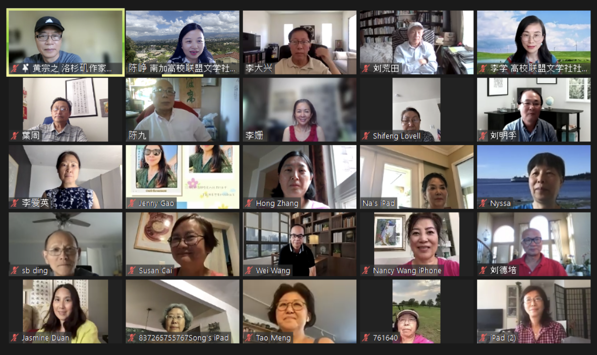 城市新闻7月23日洛杉矶报导,著名作家刘荒田、陈九在线上与北美一百多位作家、诗人和文学爱好者分享了他们多年的散文创作心得和体会。美国洛杉矶华文作家协会荣誉会长叶周、高校联盟理事长李大兴分别与刘荒田、陈九两位作家交流对谈。讲座现场气氛热烈,嘉宾金句频出,文友大呼过瘾。本次盛夏清风文学讲座是由美国洛杉矶华文作家协会和南加高校联盟文学社共同主办,由美国洛杉矶华文作家协会会长黄宗之、高校联盟理事长李大兴共同策划,由联盟文学社副社长李姗主持。