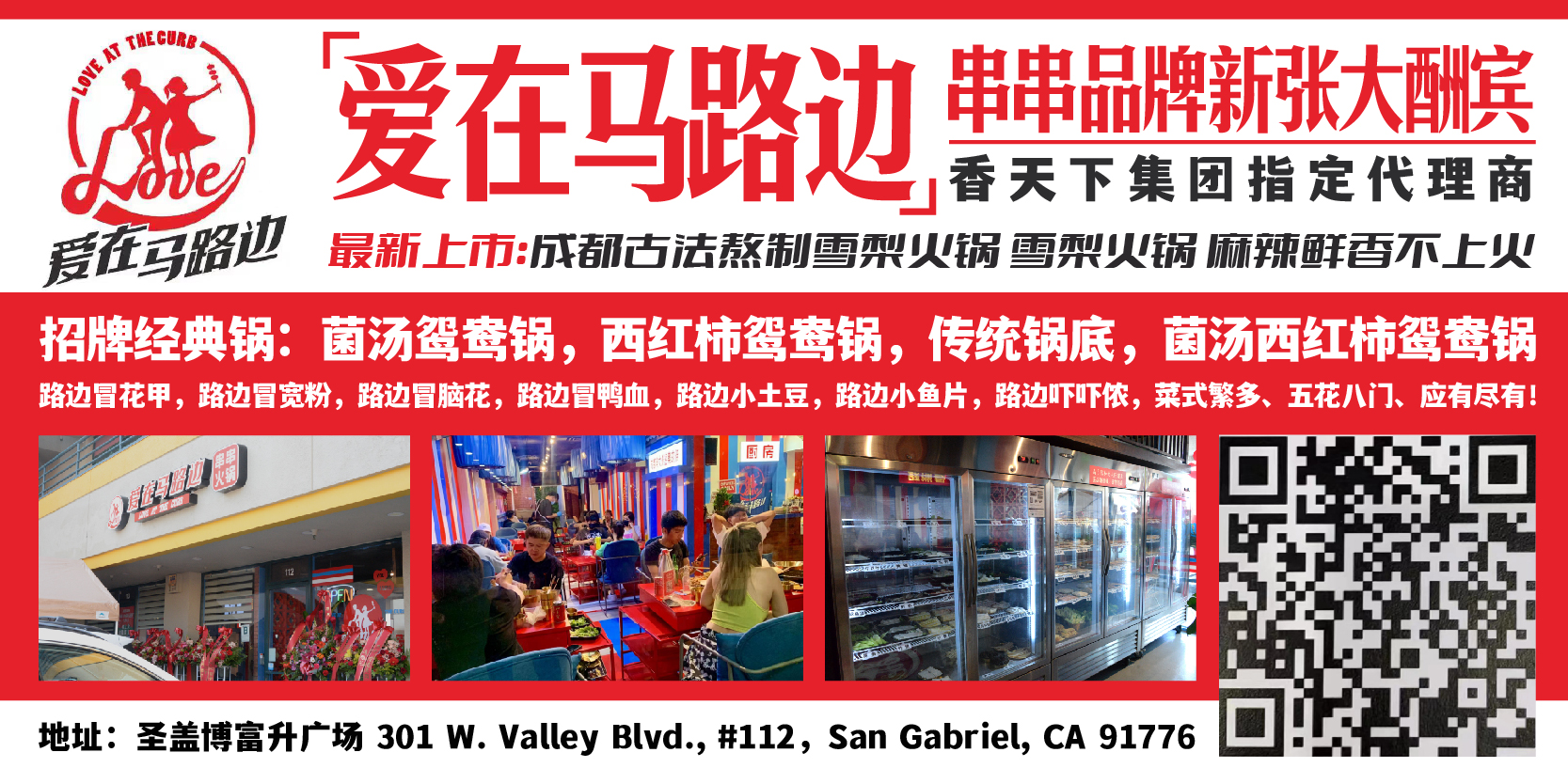 城市新闻8月3日圣盖博市报导,香天下集团指定代理商串串火锅–「爱在马路边」圣盖博市富升广场(地址:301 W. Valley Blvd., #112, San Gabriel, CA 91776,热线电话:626-782-7122)正式开业迎客,特别推出成都古法熬制雪梨火锅,引起广大食客热烈反响,新老饕客纷纷涌来,常常一位难求。现新张大酬宾,自即日起至9月3日止,全场88折大优惠。「爱在马路边」串串品牌最新推出独特的雪梨火锅,系成都古法熬制,麻辣鲜香不上火。