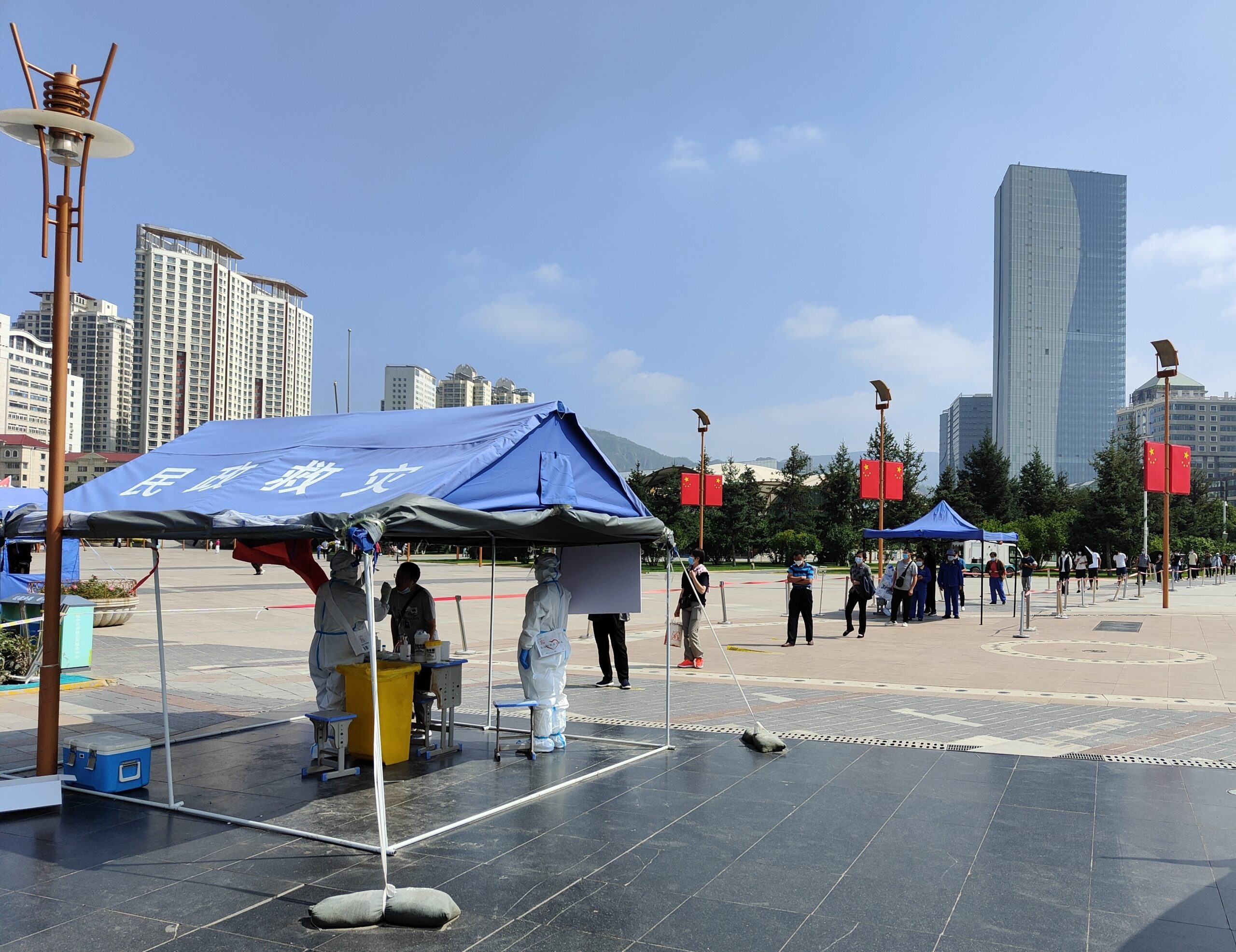 8月16日,西宁市中心广场核酸检测点,市民排队等待检测。当日,青海省西宁市开展全员核酸检测。